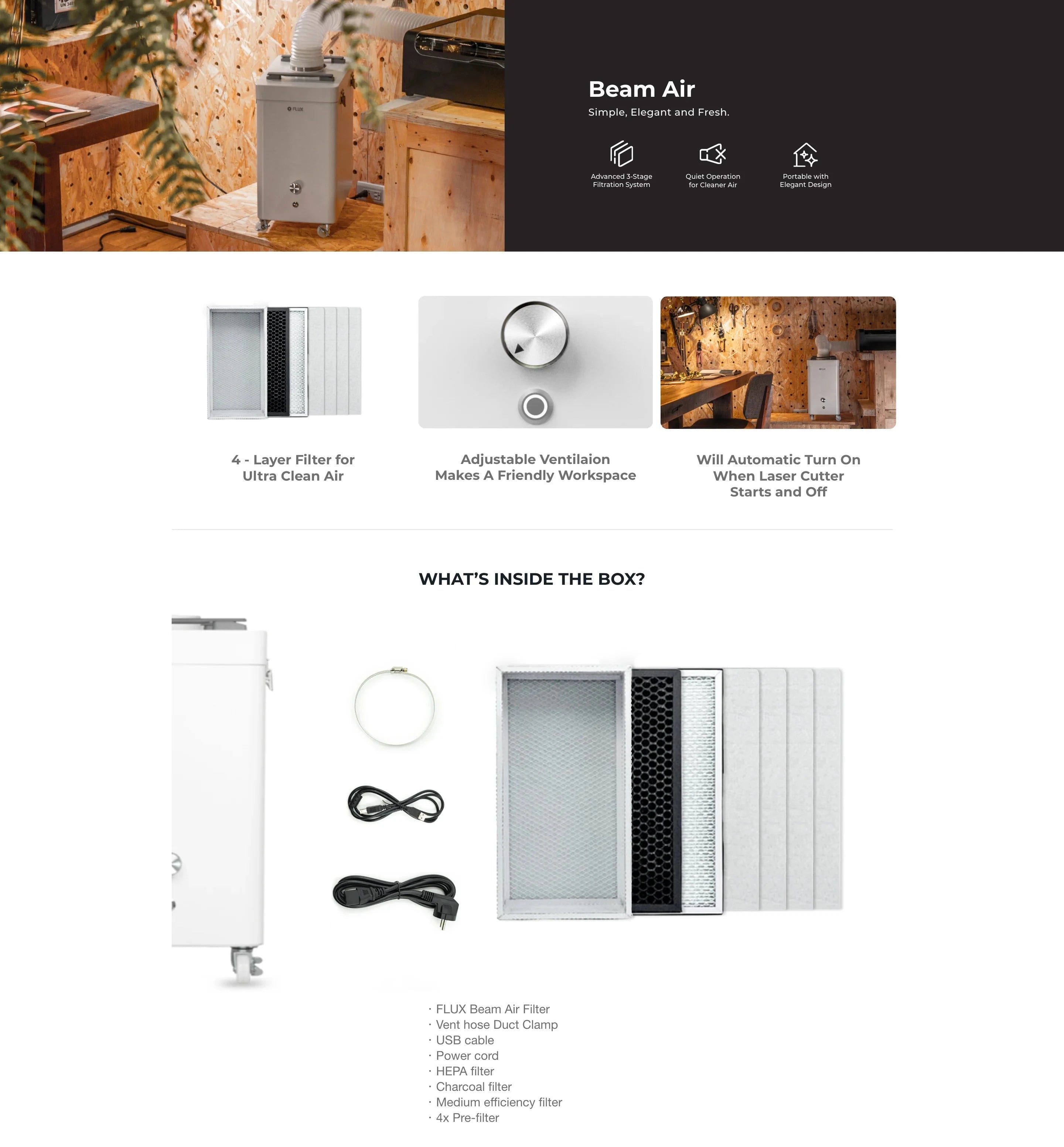 Upgrade your setup today with the FLUX Beam Air Fume Extractor – the ultimate solution for laser cutter ventilation and air purification. Search terms: FLUX Beam Air, laser fume extractor, 4-layer HEPA filter, quiet laser air purifier, universal CO2 laser ventilation.