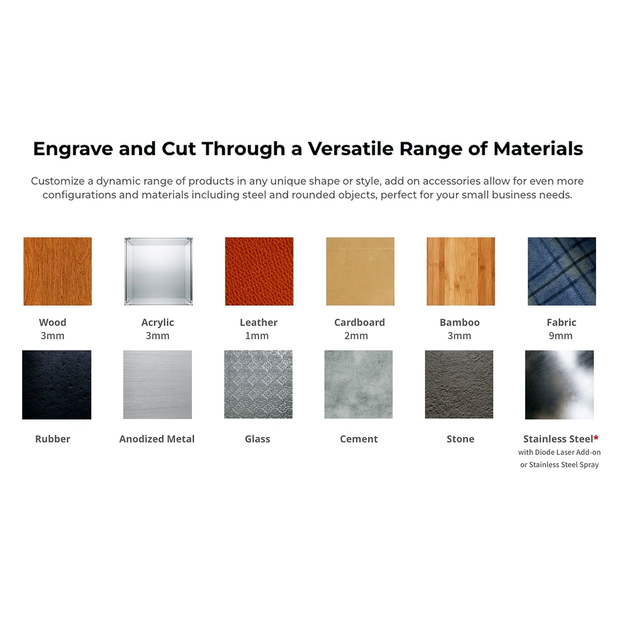 • Versatile Material Compatibility: Engrave and cut wood, MDF, bamboo, acrylic (up to 5mm cut), leather, fabric, stone, glass, and coated metals. Unlock endless possibilities in laser cutter for small business.