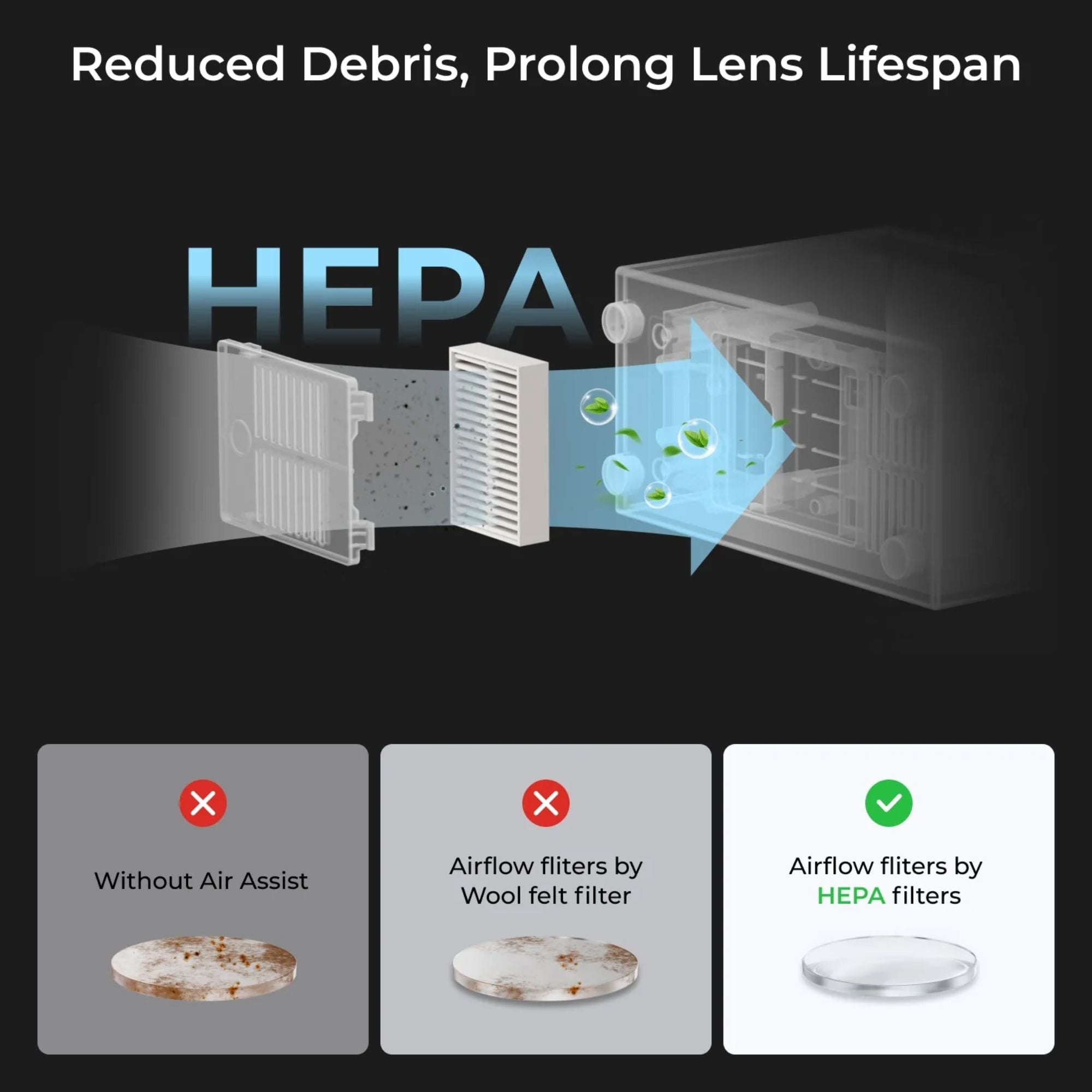 Larger, cleaner airflow prevents dust buildup on the laser lens, extending its durability.