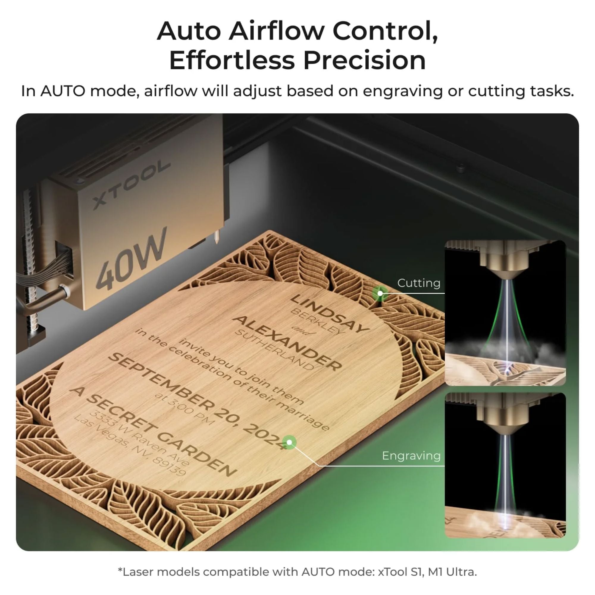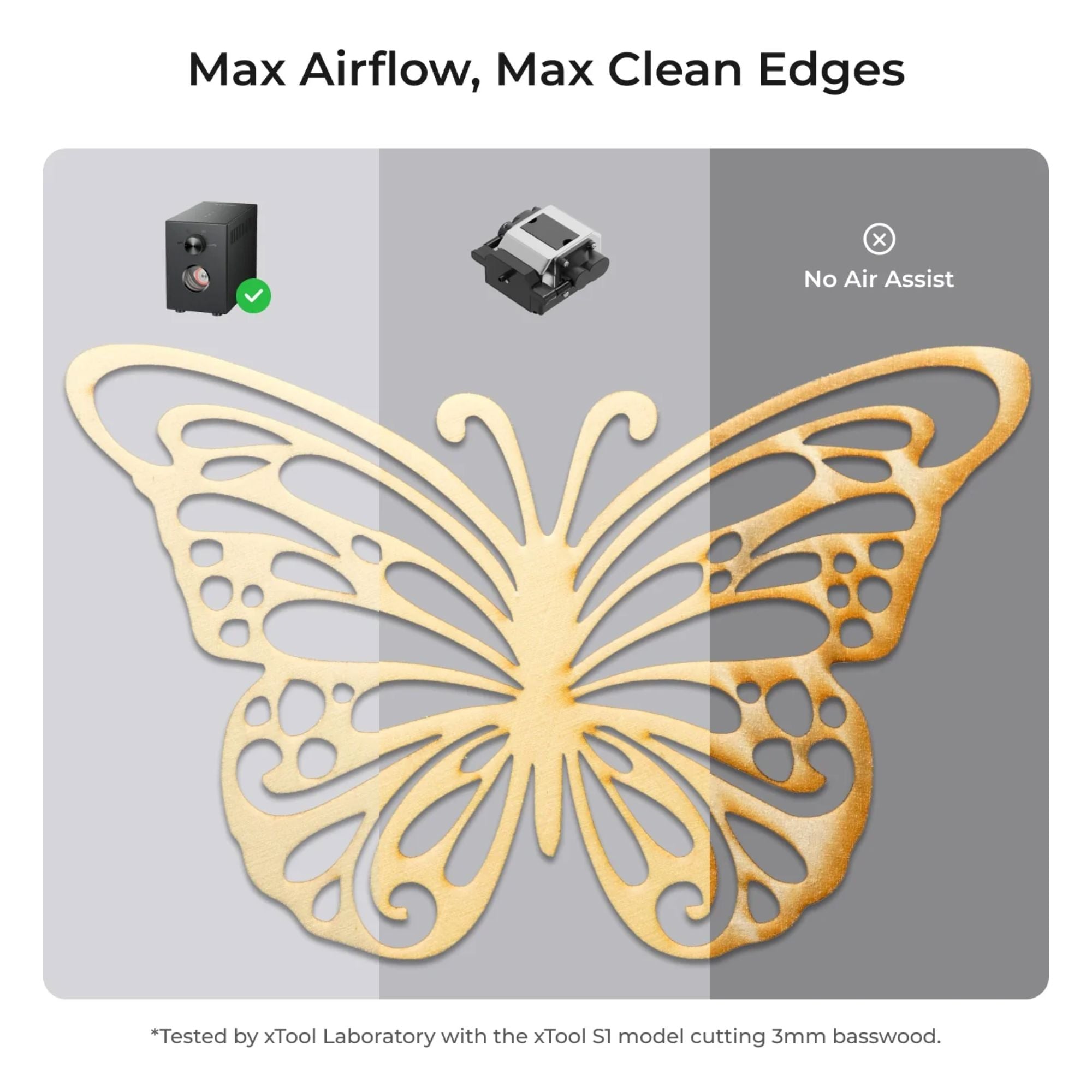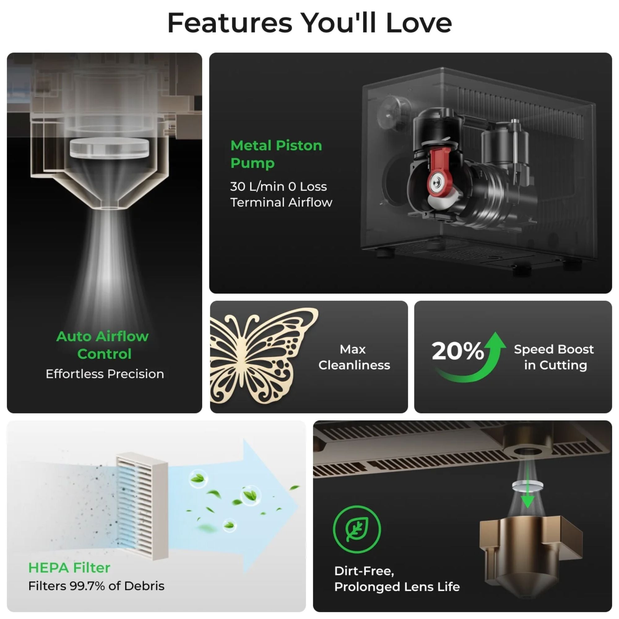 Smart Auto On/Off – Airflow auto-adjusts volume for engraving or cutting tasks, enhancing processing quality.