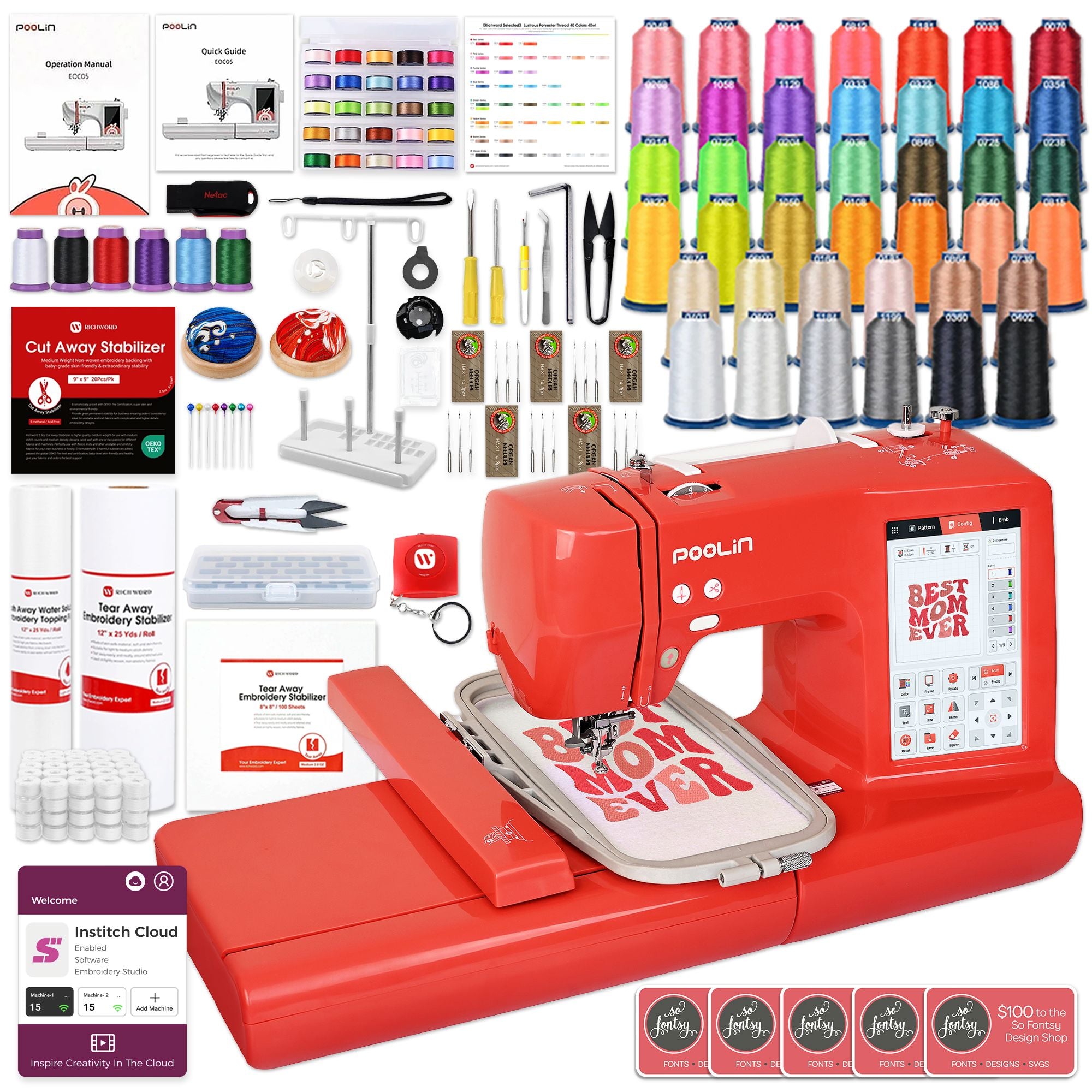 Complete Embroidery Kit: Comes with 6 rolls of polyester threads, pre-wound bobbins, stabilizers, needles (90/14), and essential tools like scissors, ensuring you’re ready to stitch right out of the box.