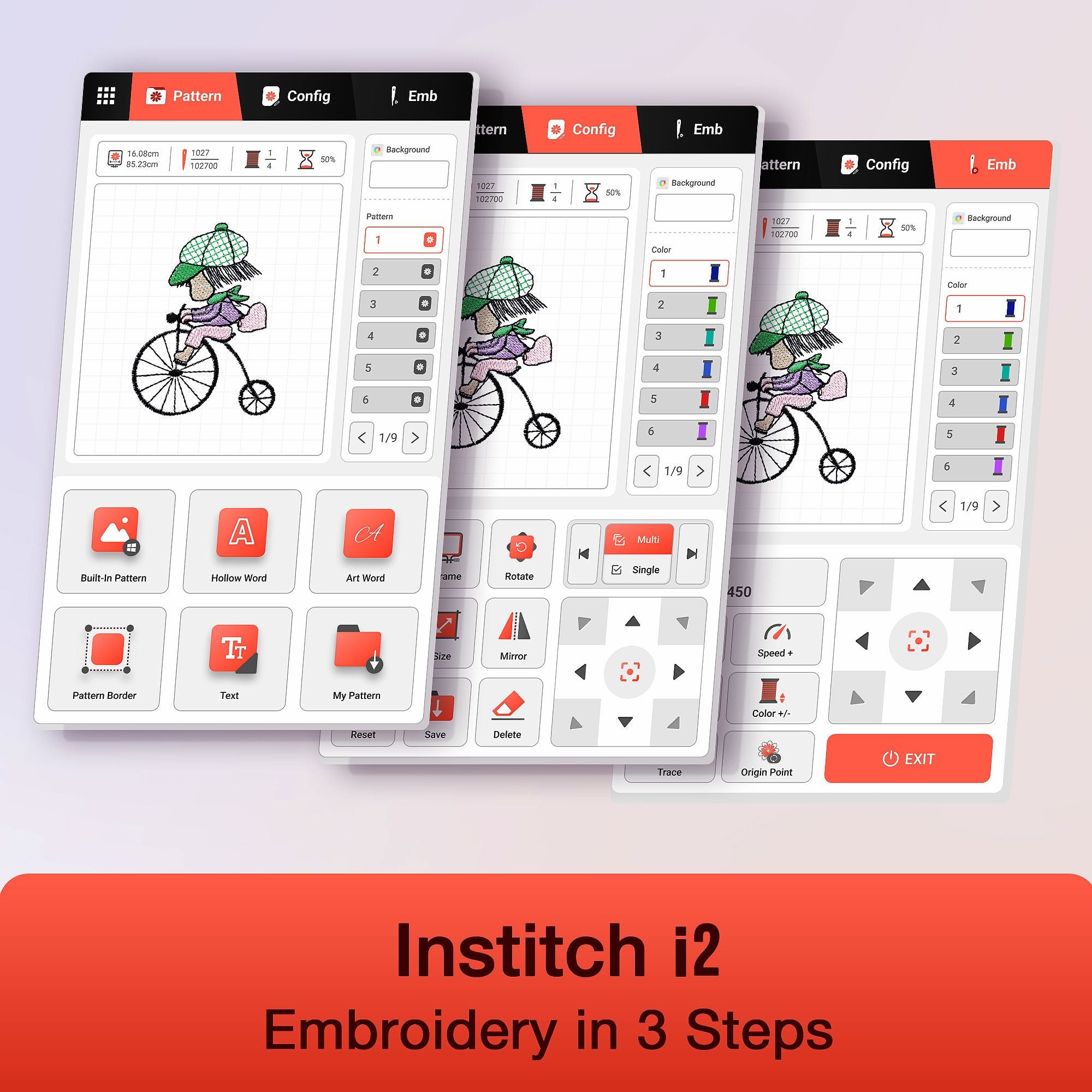 Large 7-Inch Color LCD Touchscreen: Navigate with ease using the intuitive Institch i2 system, which feels like operating a smartphone. Drag, edit, and preview patterns effortlessly for a seamless embroidery experience.