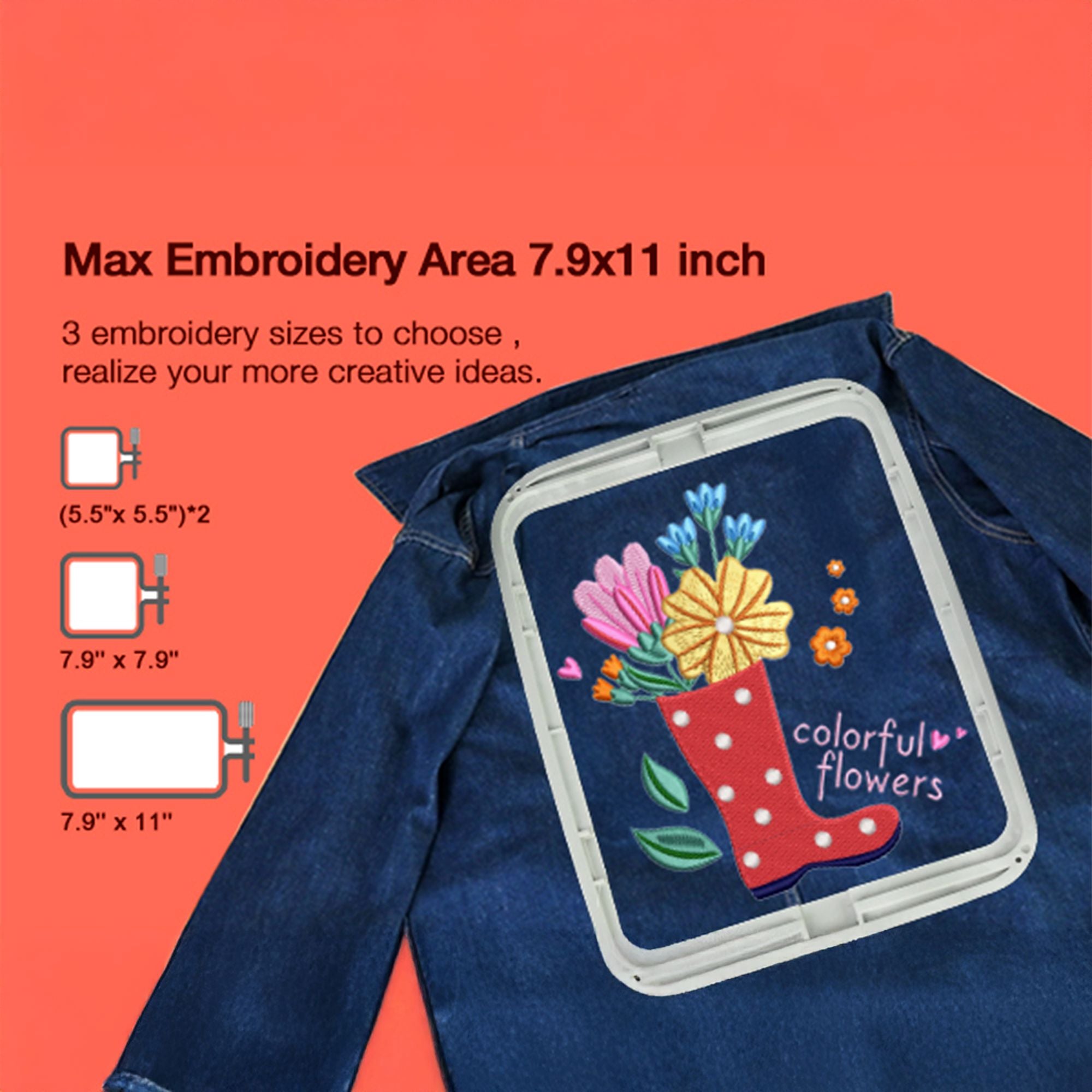 Generous 4x9.25-Inch Embroidery Area: Perfect for a wide range of projects, from embellishing sweatshirts, canvas bags, and beanies to creating custom patches and home décor. Includes a 4x4-inch hoop for smaller designs like collars, cuffs, and socks.