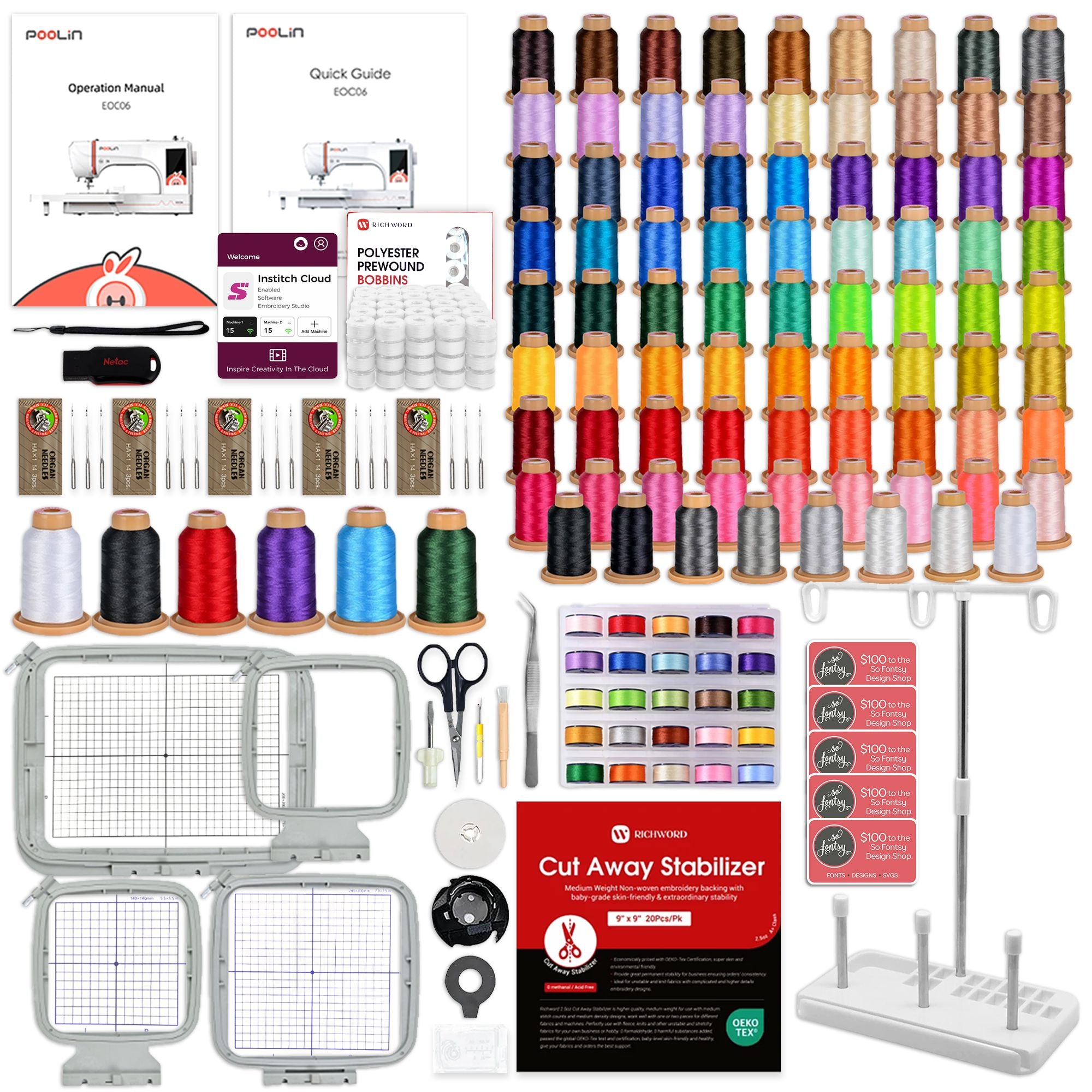 POOLIN EOC06 7.9in x 11in Embroidery Machine & Embroidery Thread Bundle - Red