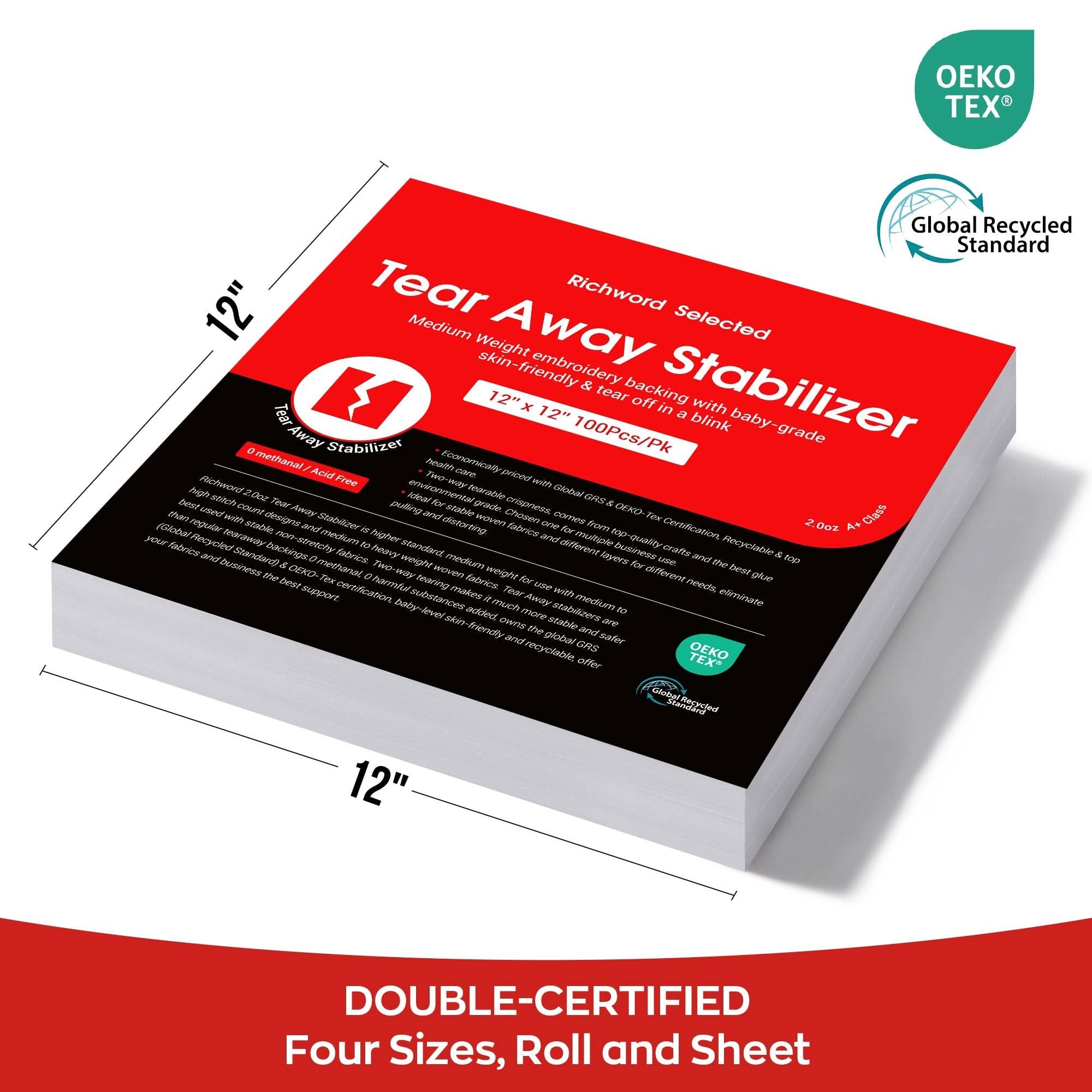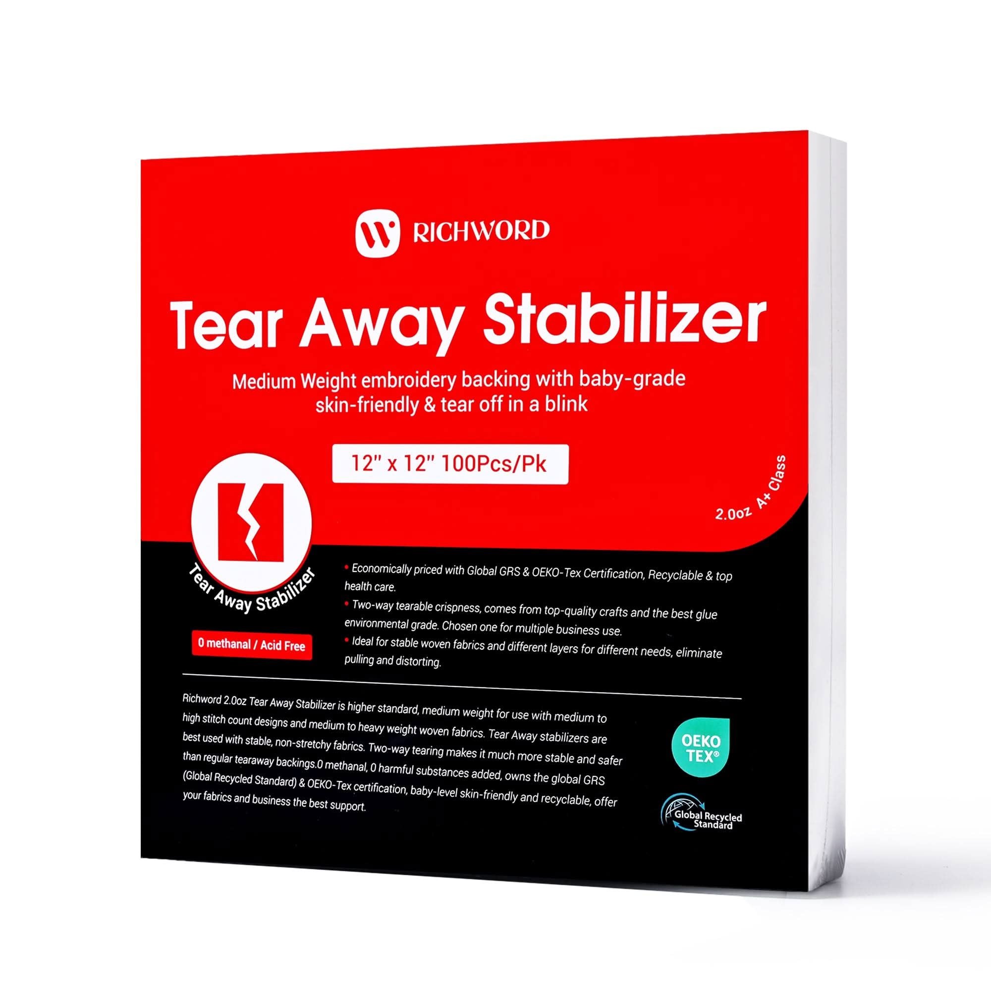 Richword Tear Away Embroidery Stabilizer - 2.0oz, 12in x 12in, 100pc Pack: Premium Backing for Flawless Machine Embroidery