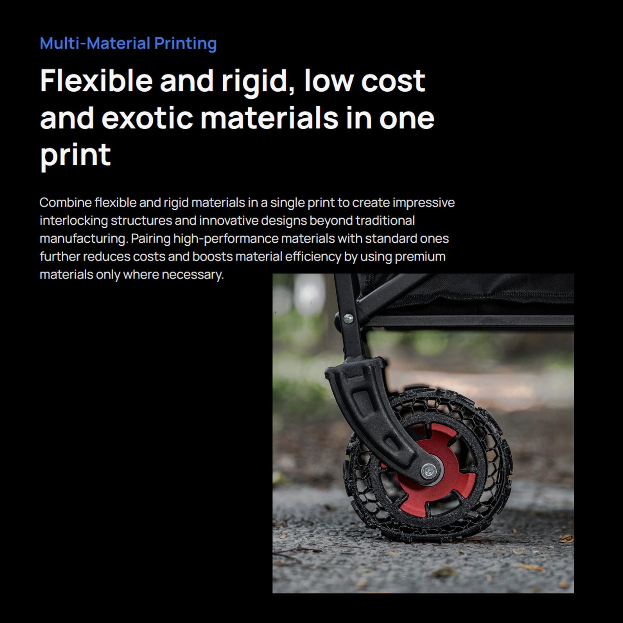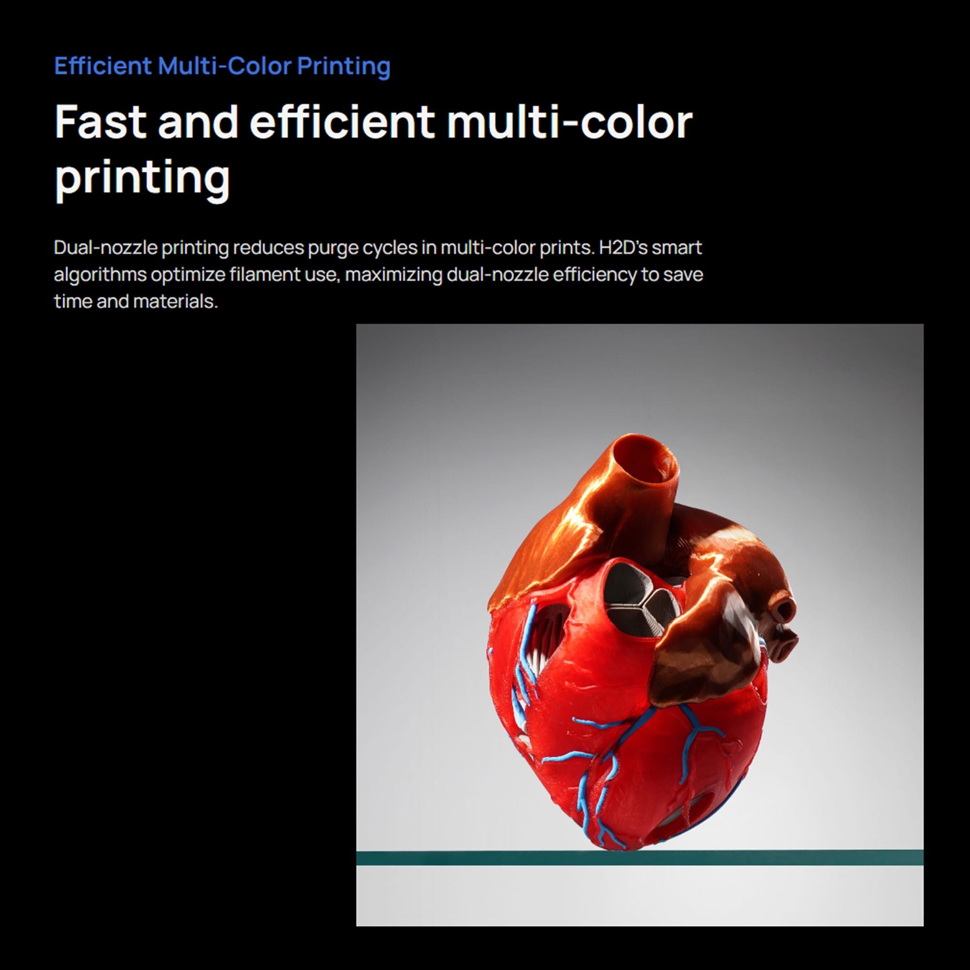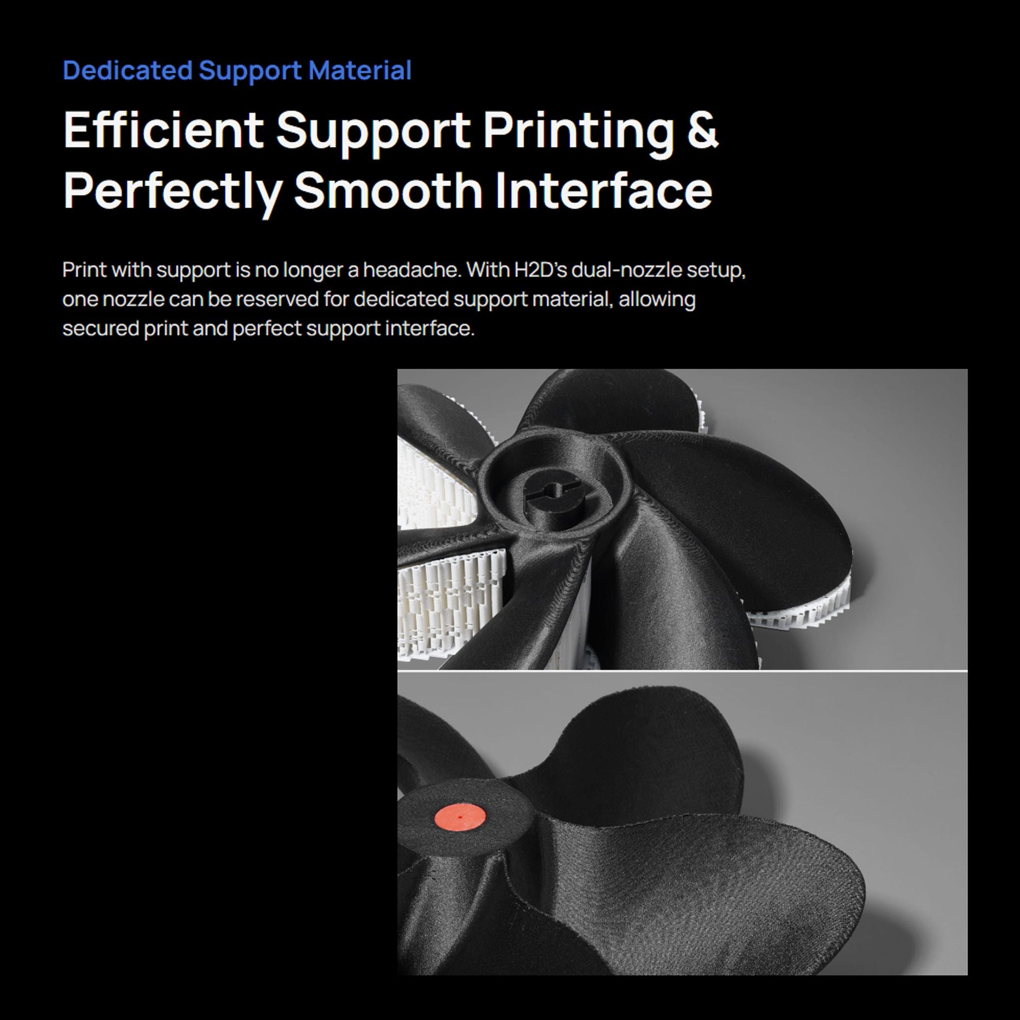 The H2D PRO’s dual-nozzle system enables seamless multi-material and multi-color printing, supporting up to 24 filament slots with the AMS 2 PRO and AMS HT systems. Print flexible materials like TPU alongside rigid filaments such as PLA, PETG, ABS, or carbon/glass fiber-reinforced polymers in a single job. The dedicated support material nozzle minimizes waste, reduces purge cycles, and simplifies post-processing for cleaner, professional-grade parts.