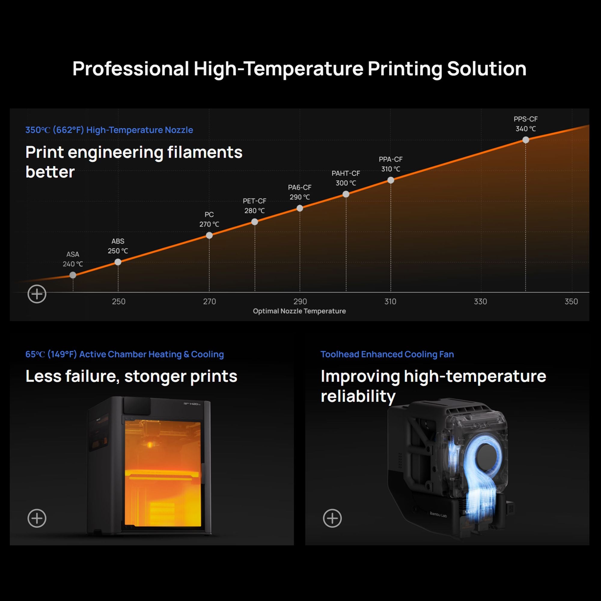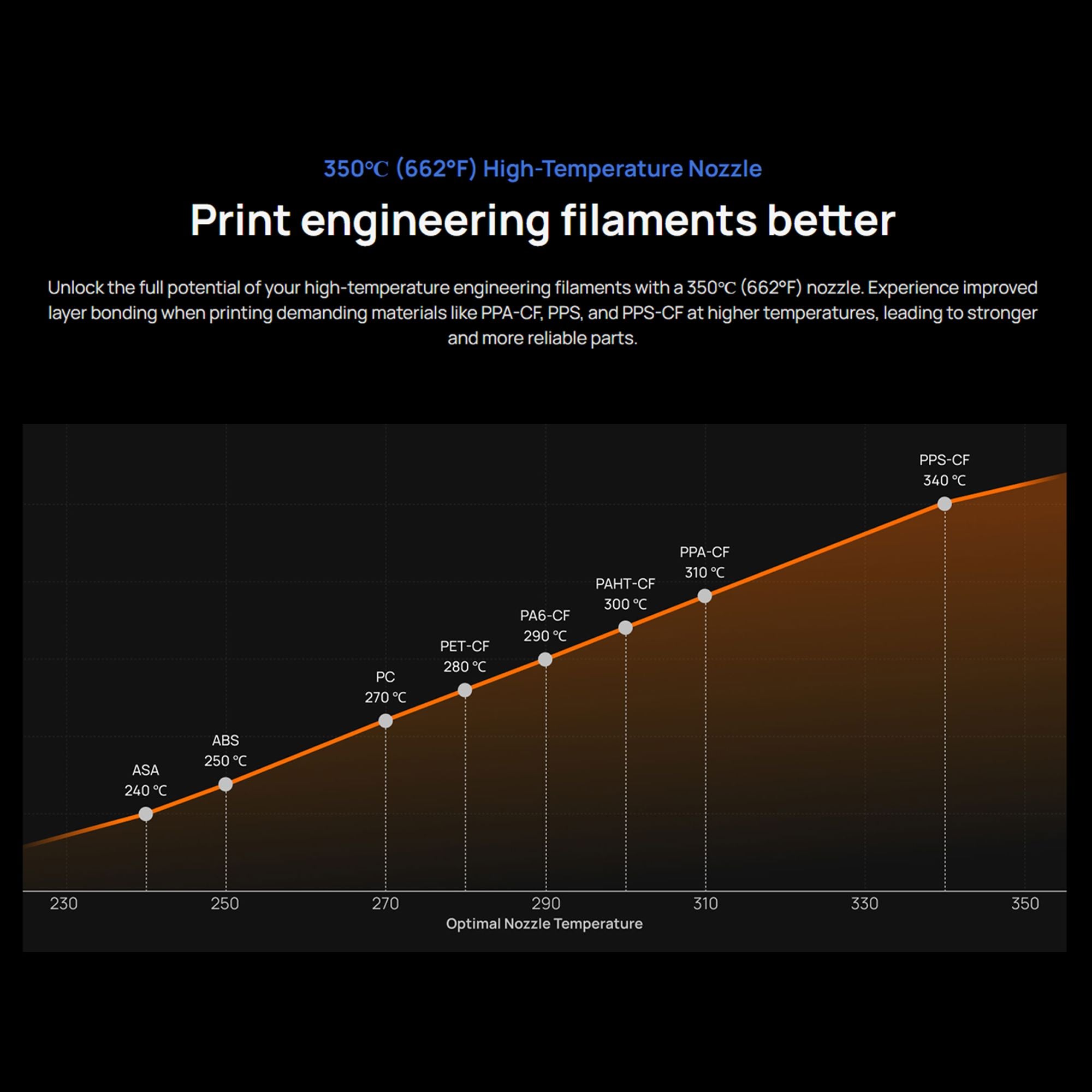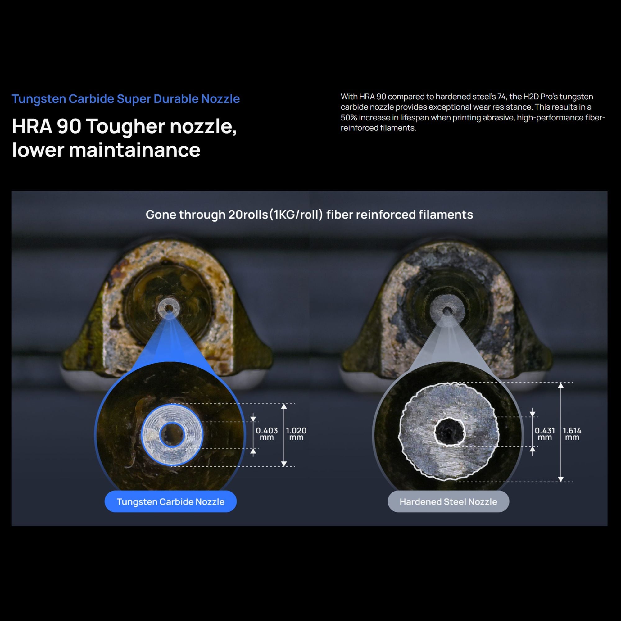 Unlock the full potential of high-performance filaments with the H2D PRO’s 350°C all-metal hotend and 65°C active heated chamber. These features eliminate warping and ensure superior layer bonding for materials like nylon, PC, PPS, and carbon fiber composites. The tungsten carbide nozzles (HRA 90 hardness) offer 50% longer lifespan, resisting wear from abrasive filaments for consistent, reliable results.