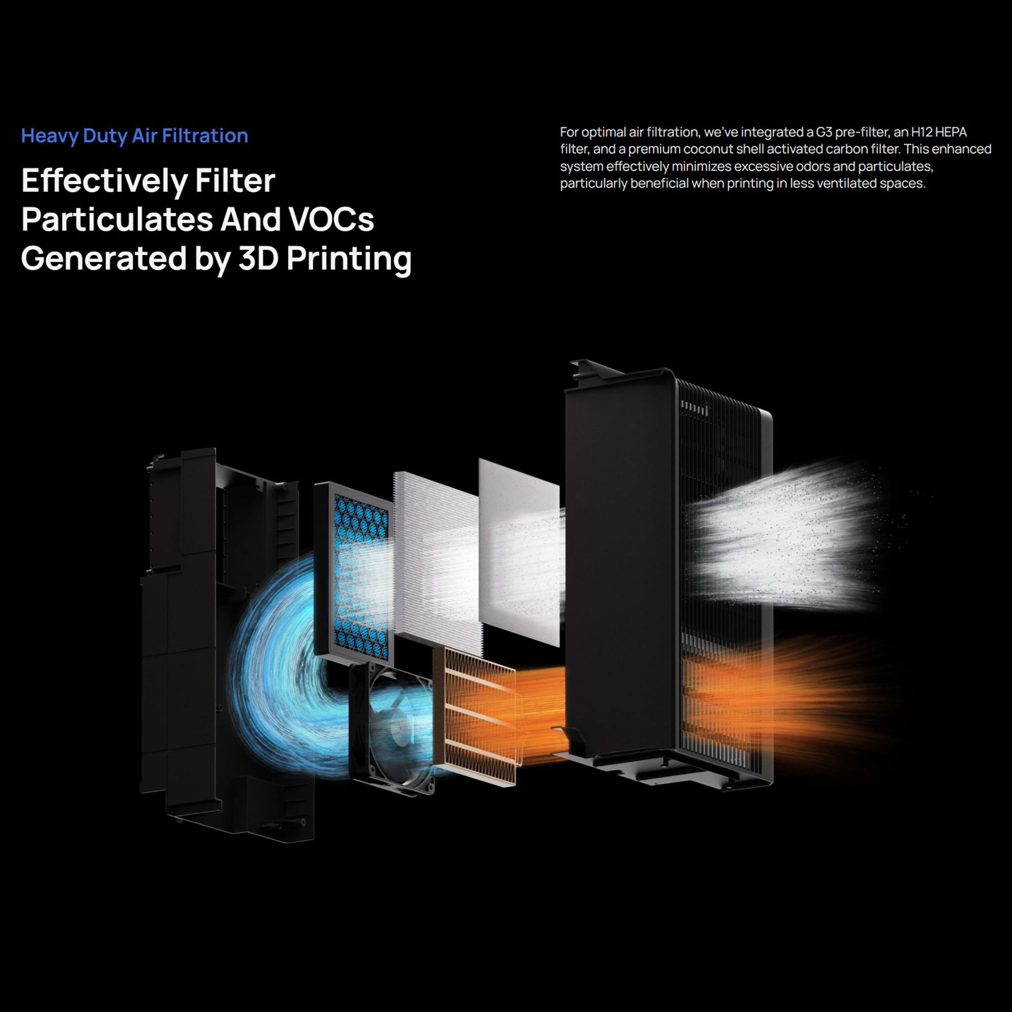 The H2D PRO ensures a safe and healthy workspace with multi-stage filtration (G3 pre-filter, H12 HEPA, activated carbon) to remove particulates and VOCs. An emergency stop button and five flame sensors with AI-powered fire detection provide peace of mind during operation.