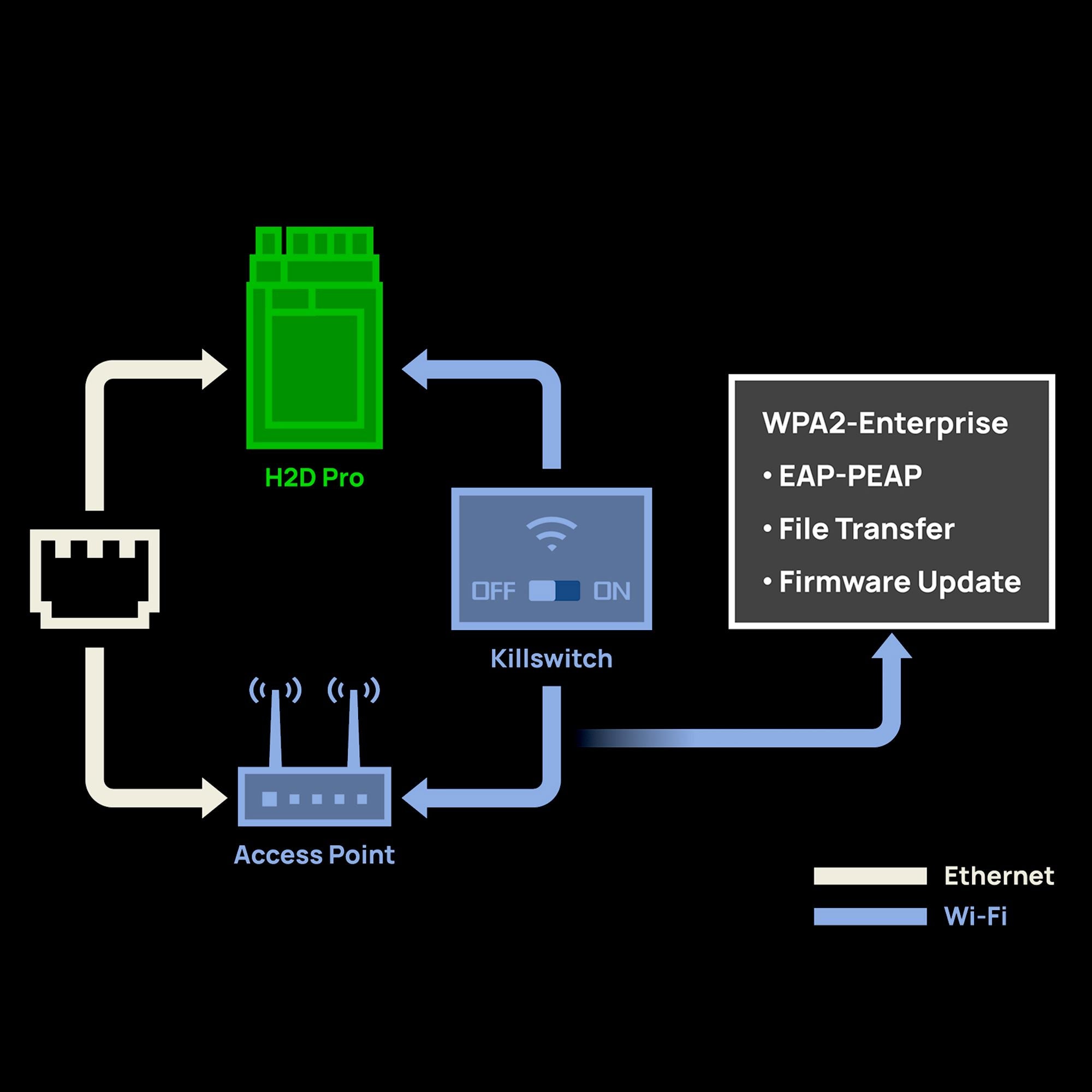 Designed for professional environments, the H2D PRO prioritizes data security with WPA2-Enterprise Wi-Fi, Ethernet connectivity, and a physical network kill switch to eliminate unauthorized access risks. Seamlessly integrate into enterprise workflows with custom fleet management support, ensuring secure and efficient operation across multiple printers.
