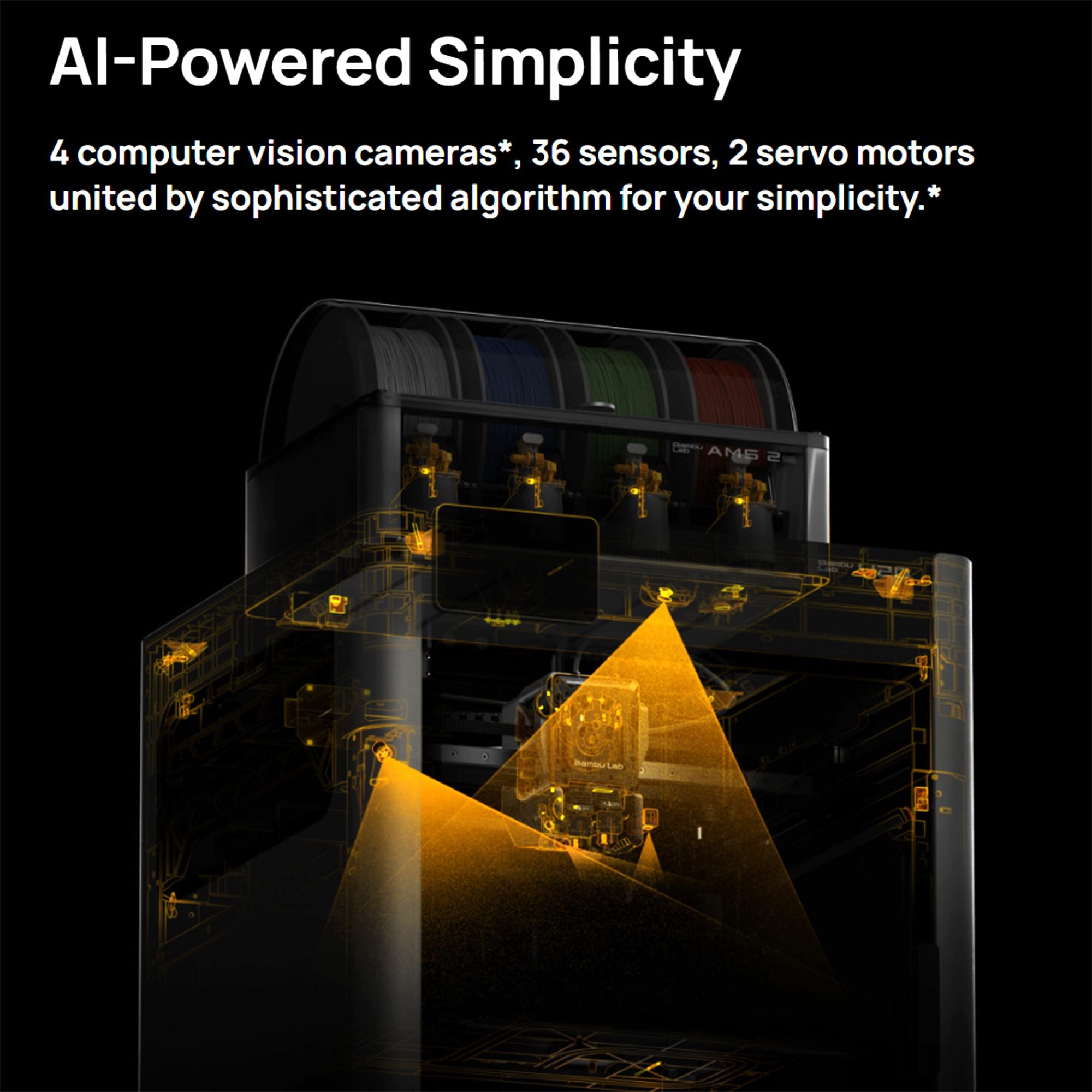 The H2D PRO is equipped with a quad-camera vision system and 36 sensors, including an AI-backed nozzle camera and 15-point filament monitoring, to deliver unmatched reliability. The DynaSense Extruder with PMSM servo architecture ensures precise extrusion control, detecting clogs, filament grinding, and run-outs in real-time.