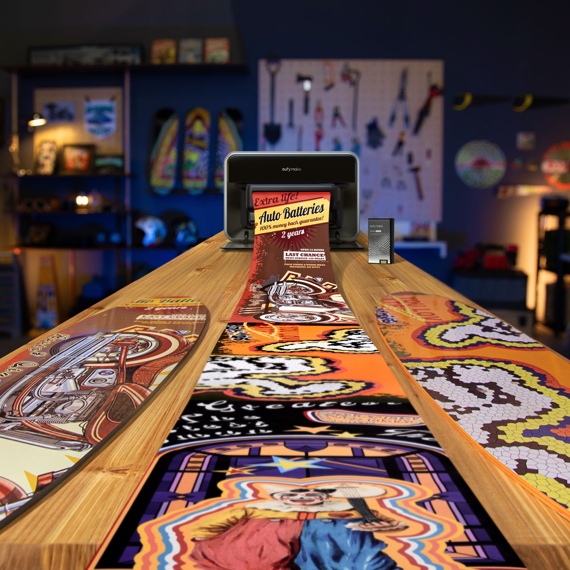 Roll-to-Roll Attachment – Need large-format printing? The roll-to-roll attachment transforms your EufyMake E1 into a continuous feed printer supporting designs up to 10 meters long. Create eye-catching banners, custom skateboard graphics, vehicle wraps, oversized decals, and long-format promotional materials without size limitations.