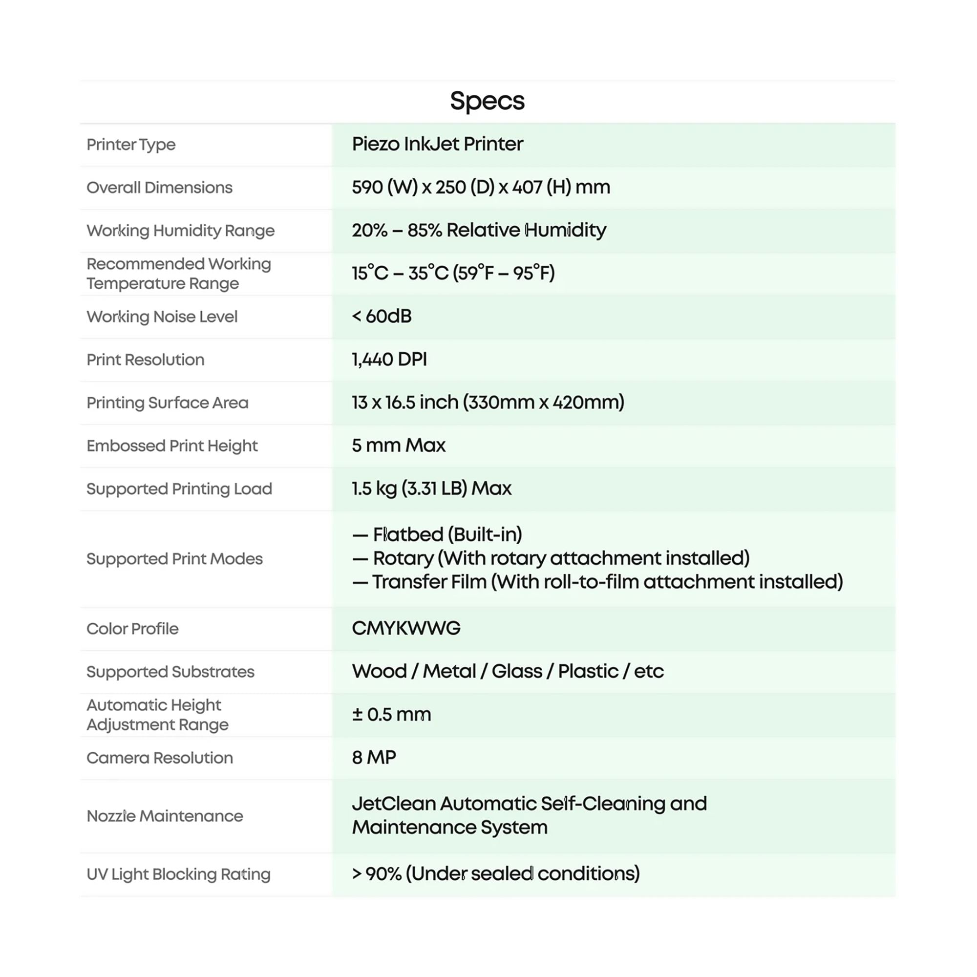 • Flatbed Printing: Supports 3D-texture printing up to 5 mm high on materials such as metal, wood, and acrylic. Printing Size: Up to 13 x 16.5 inches (A3 size)