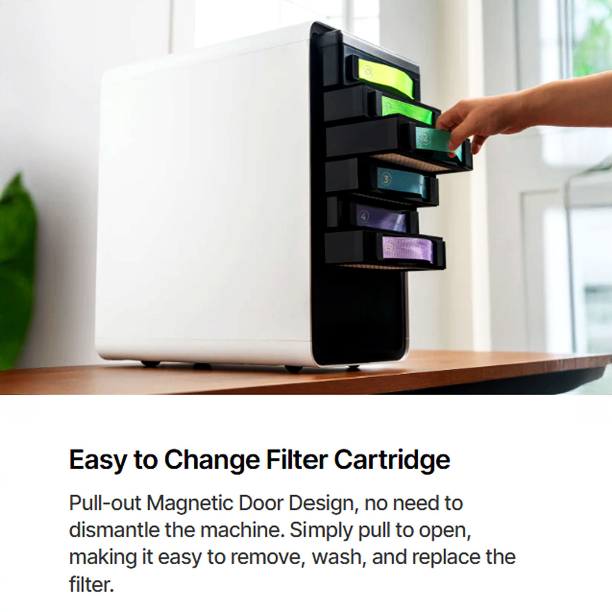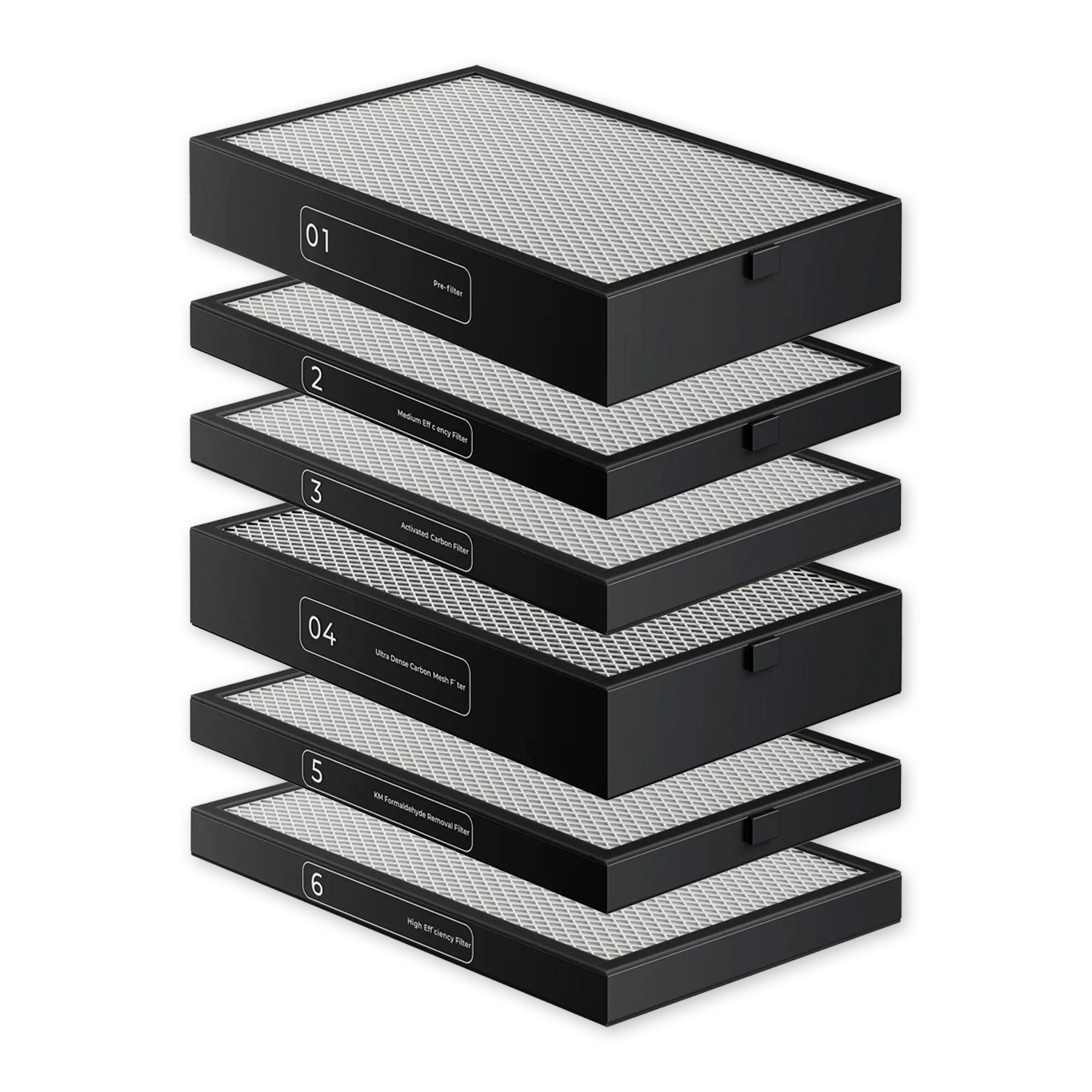 7-Layer Filtration System: Features Ultra-Dense Carbon Mesh, HEPA filters, Activated Carbon, and a specialized formaldehyde filter to remove 99.97% of airborne contaminants, including harmful fumes, smoke, and fine particles.