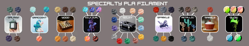 SHOP BASIC FILAMENTSpecialty PLA filaments, such as wood-textured, marble-textured, sparkle, metallic, silk, and silk dual-tone options, open up a world of creative possibilities in 3D printing. These filaments provide unique finishes and visual effects, from natural wood grain or stone-like patterns to shimmering metallic or glossy, vibrant silk appearances. Ideal for artistic projects, decorative pieces, and premium prototypes, specialty PLA filaments combine ease of use with stunning aesthetics, allowing makers to elevate their creations.