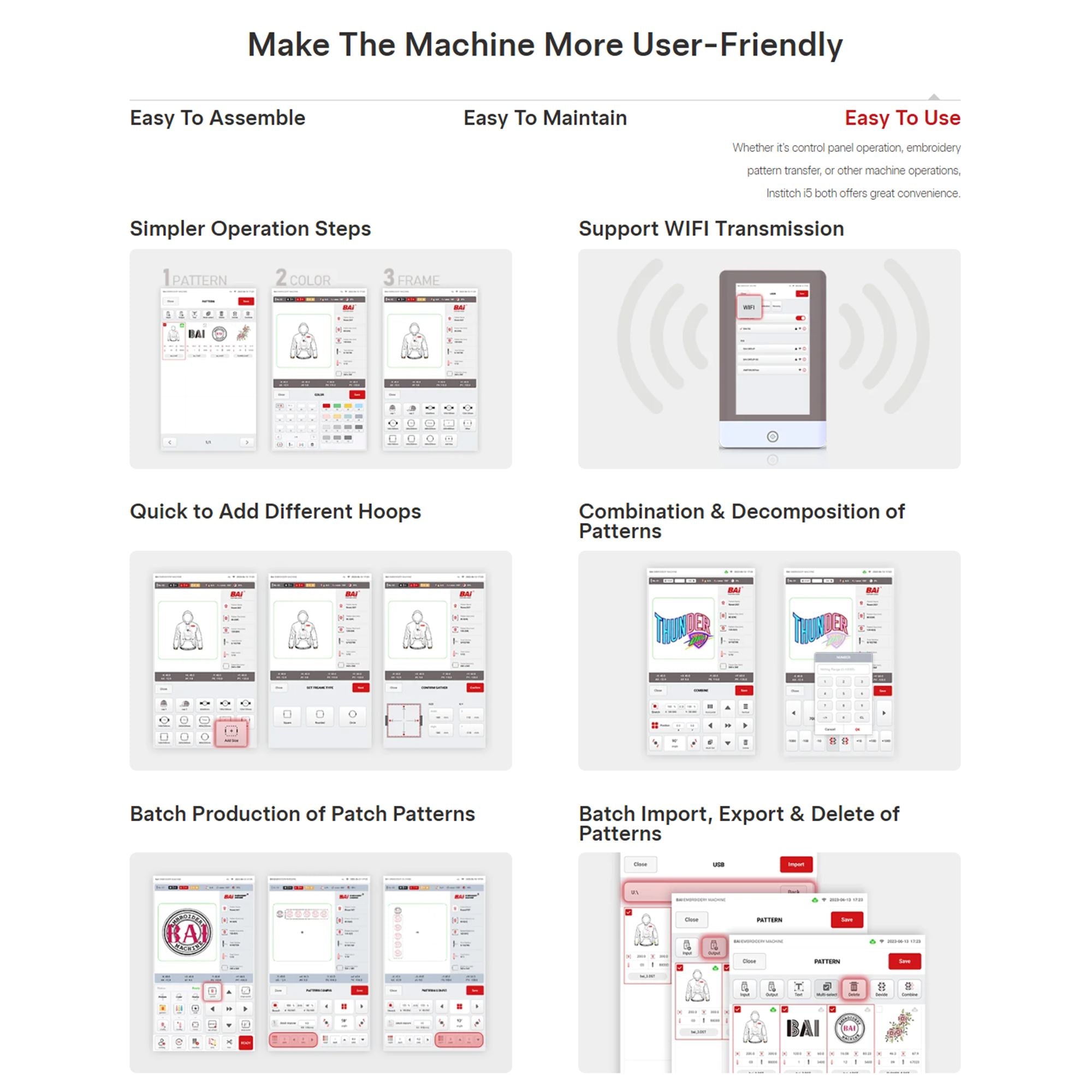 Easy To Use - Whether it's control panel operation, embroidery pattern transfer, or other machine operations, Institch i5 both offers great convenience.