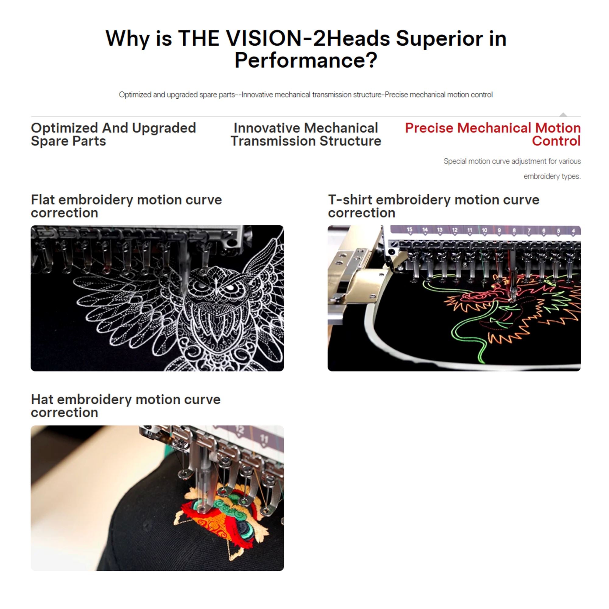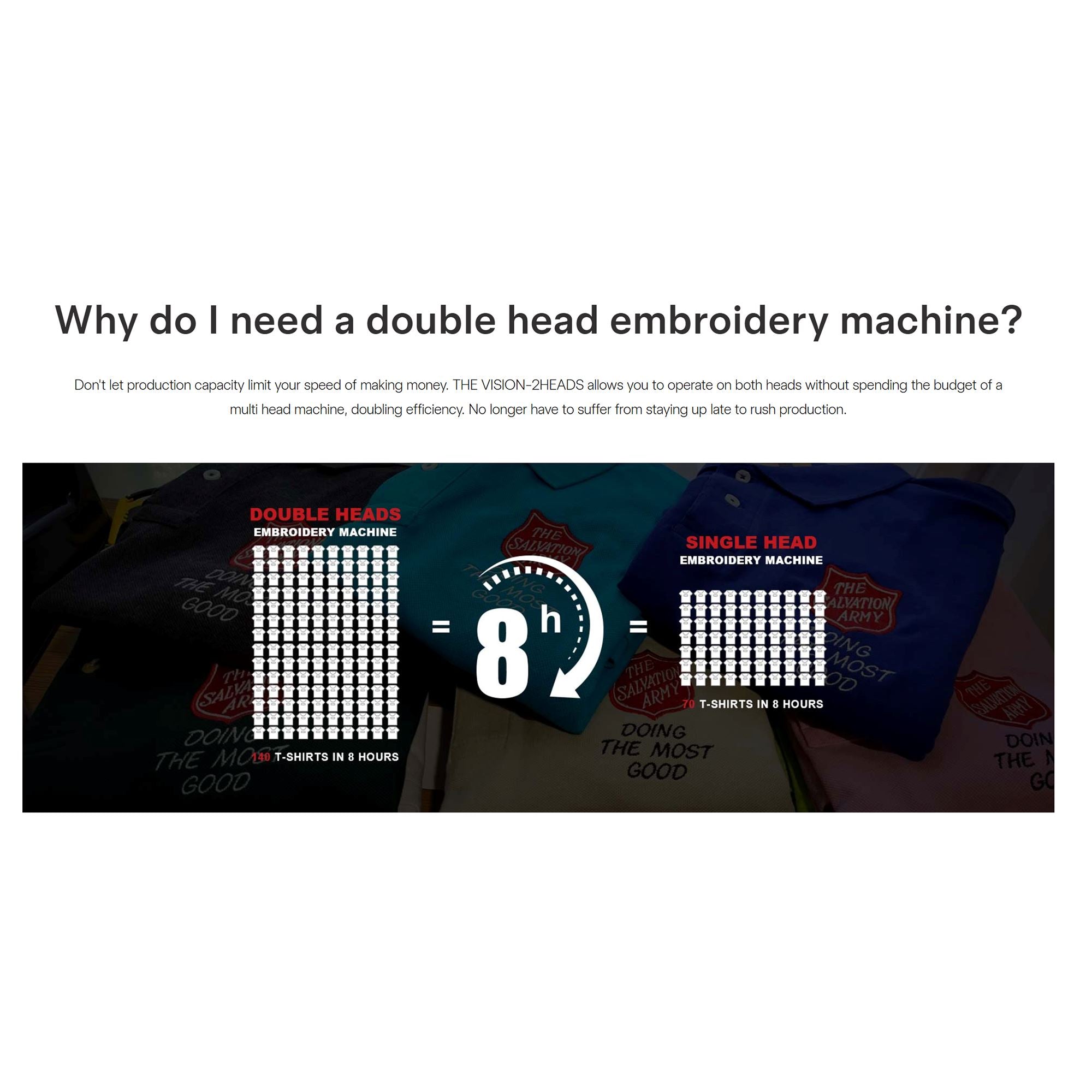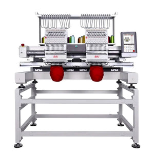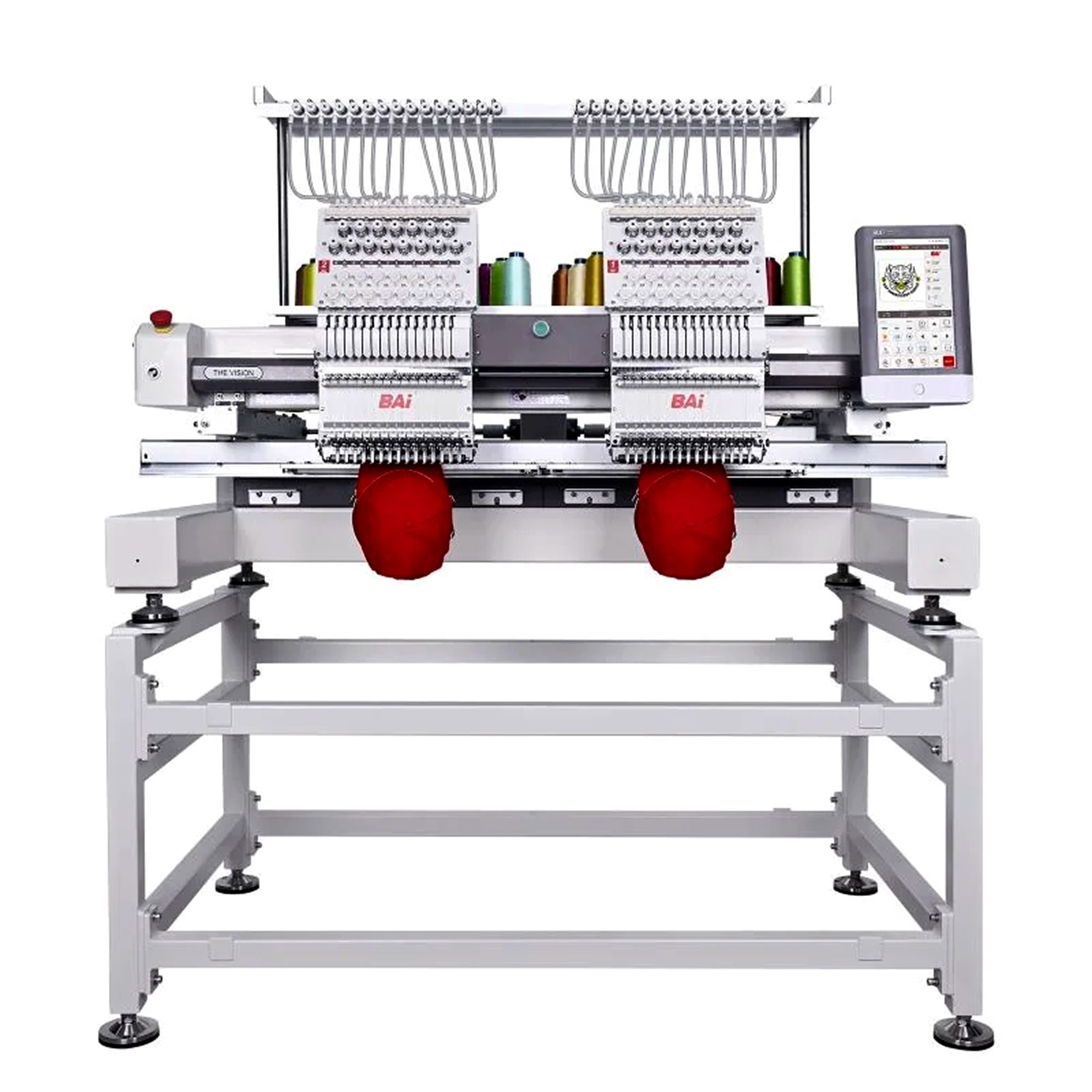 BAi THE VISION dual head is the ultimate professional Embroidery Machine featuring two 15 Multi Needle Computerized Embroidery Machine heads for fast high quality embroidery production. THE VISION line is the upgrade from the BAI MIRROR and features two 15 Needle heads, two full cap & hat frames, 20 flat frames, stand, Japanese & German quality parts, and lots of accessories.
