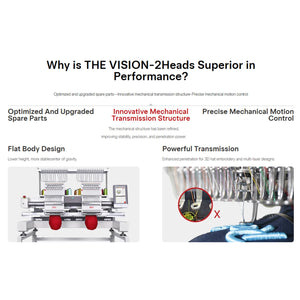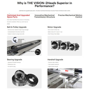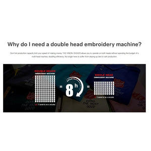 THE VISION (2 Heads) focuses on the embroidery quality and is responsible for the embroidery results; it is more stable, quieter and more precise. It's the perfect upgrade to single-head machines, doubling your production capacity without breaking the bank and is the perfect addition to smaller shops. Don't let production capacity limit your speed of making money. THE VISION-2HEADS allows you to operate on both heads without spending the budget of a multi head machine, doubling efficiency. No longer have to suffer from staying up late to rush production. Use THE VISION (2 Heads) to embroider hats, clothing, bags, hoodie jackets, leather, shoes, patches and more. We offer both Personal and Business Financing on all BAi Embroidery Machines.