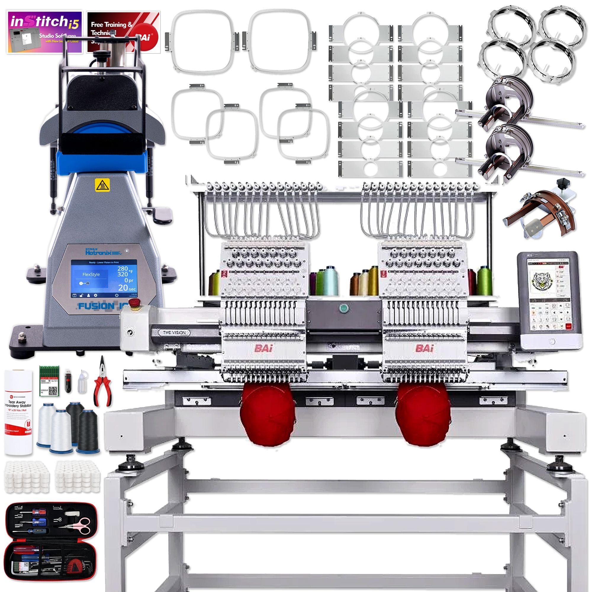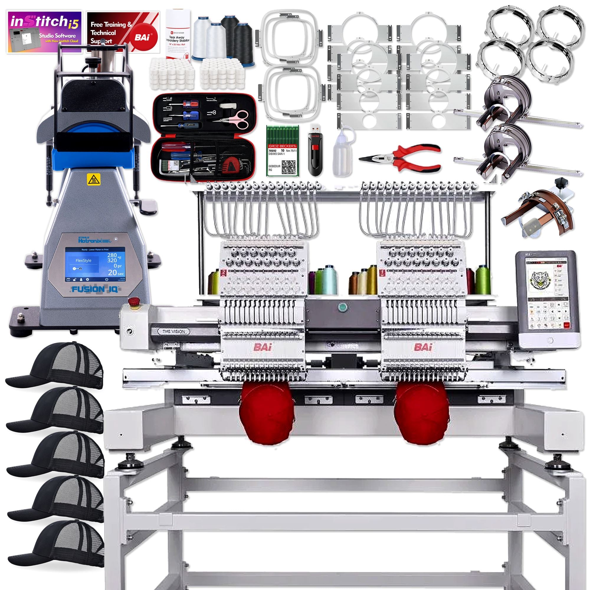 BAi THE VISION dual head is the ultimate professional Embroidery Machine featuring two 15 Multi Needle Computerized Embroidery Machine heads for fast high quality embroidery production. THE VISION line is the upgrade from the BAI MIRROR and features two 15 Needle heads, two full cap & hat frames, 20 flat frames, stand, Japanese & German quality parts, and lots of accessories. Combined with the Hotronix 360 IQ Cap & Hat Press this makes the perfect bundle for embroidering and applying patches to hats.