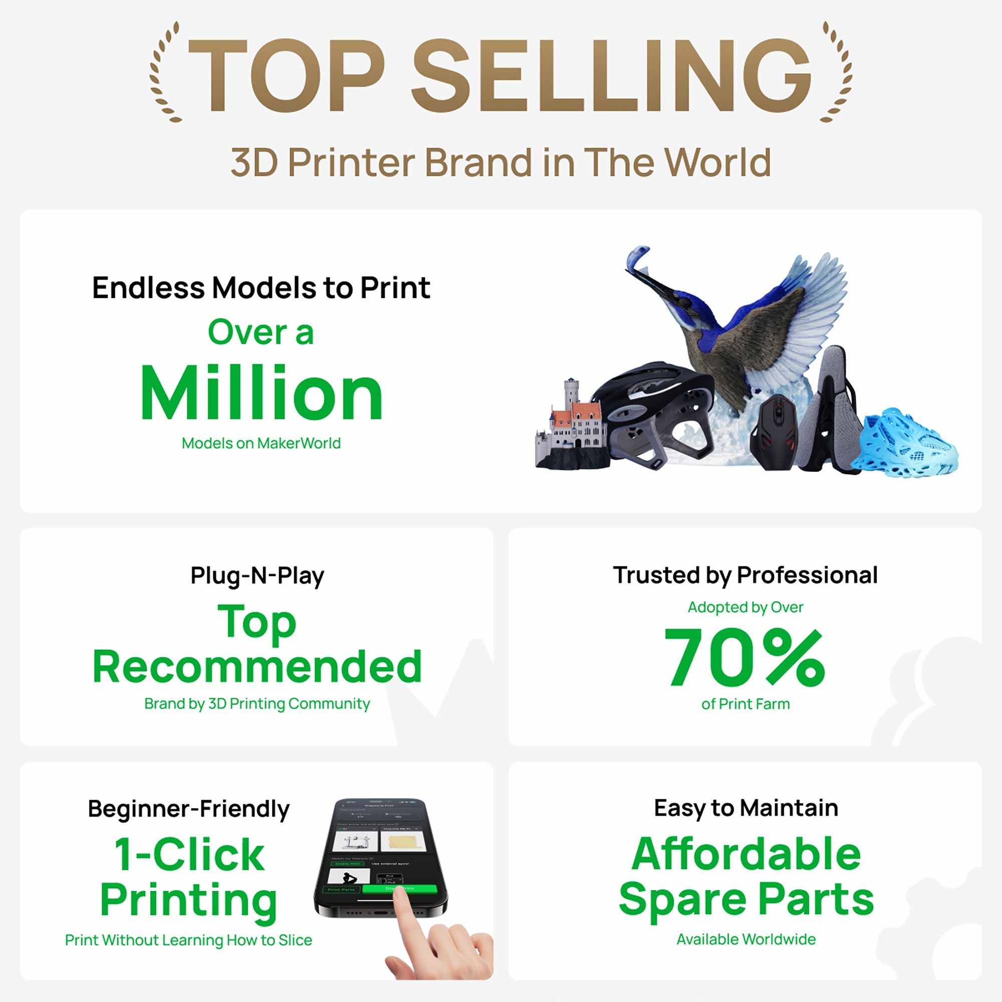 Full-Size Print Volume: Generous space for you to expand your fantasy. A1 features 256mm*256mm*256mm build volume, bigger than most of the entry-level printers. Print a helmet in one go, we got you.