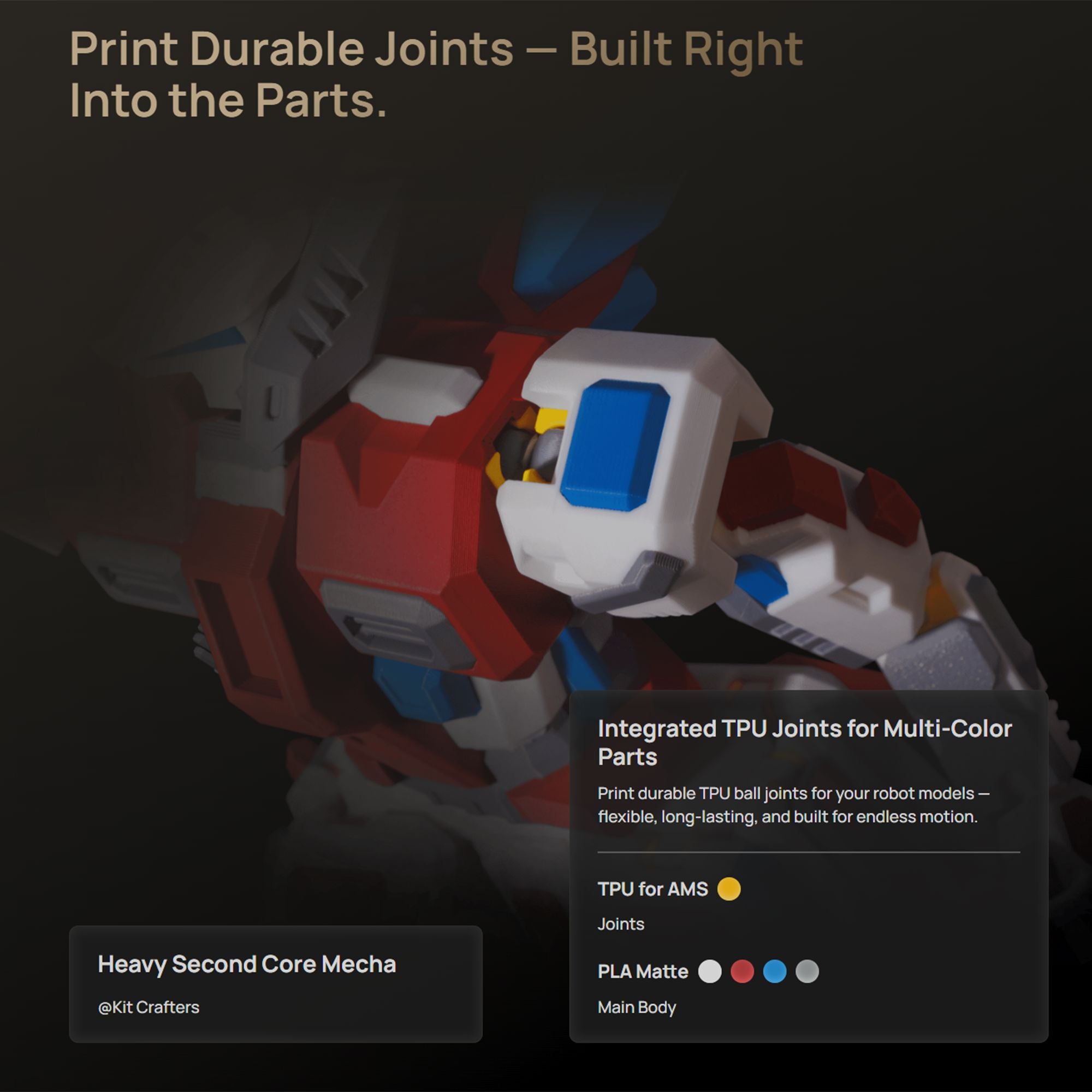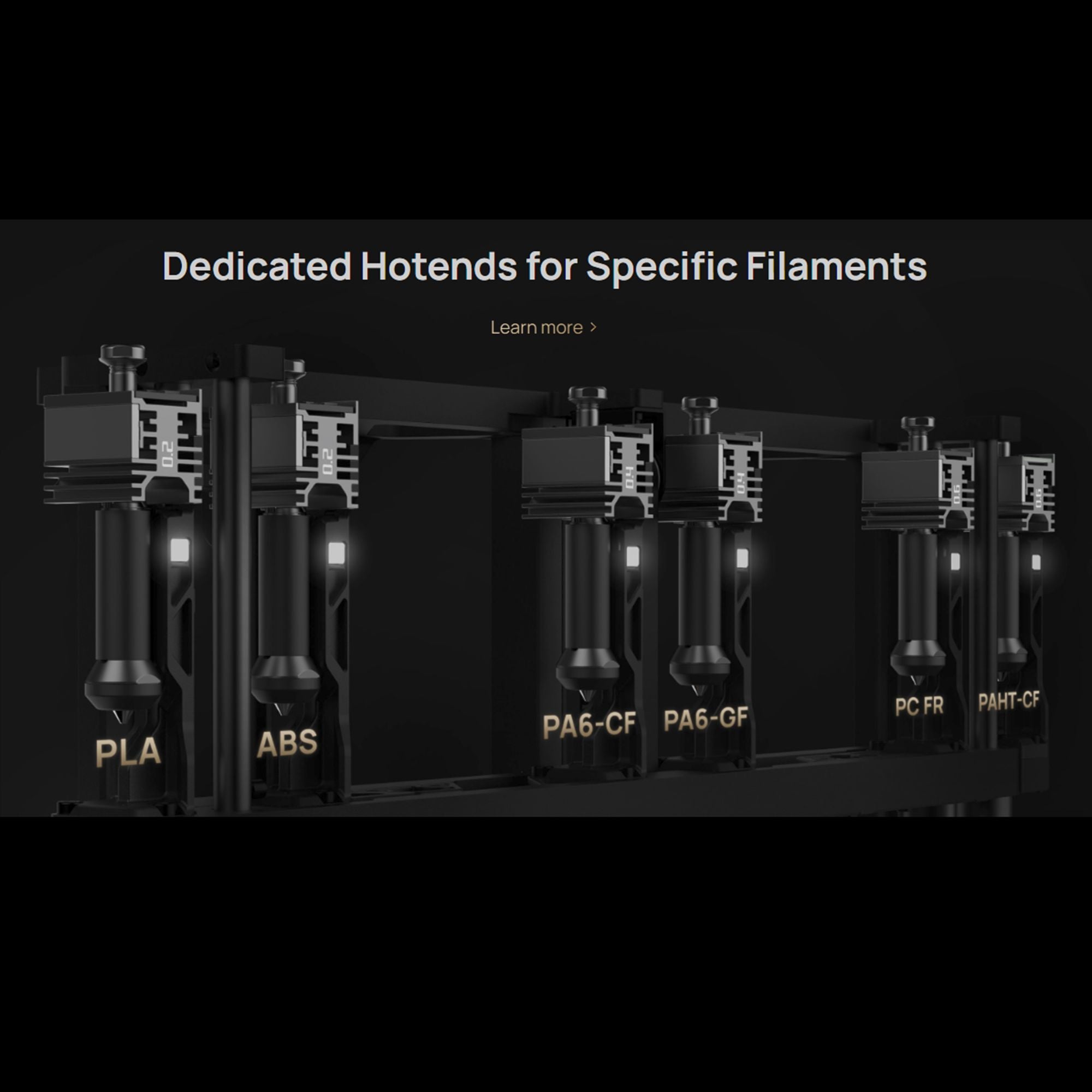 Because only the hotend is swapped, the system can house up to six replaceable hotends without significantly reducing the build volume. That means more materials, more colors, and more possibilities — all in one print.