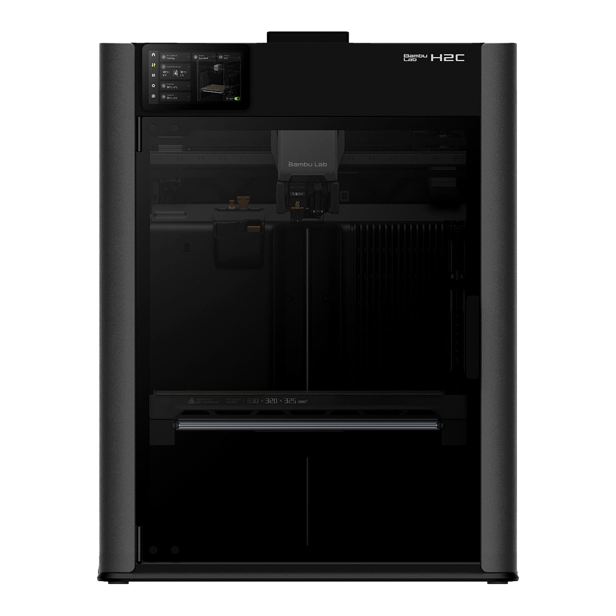 Engineered for precision and ease, the Bambu Lab H2C integrates advanced AI features, including 59 sensors and a quad-camera vision system with neural algorithms for real-time error detection—monitoring extrusion patterns at 20 kHz sampling rates to catch filament grinding, clogs, or deviations instantly. The active heated chamber reaches 65°C to prevent warping, while the heatbed hits 120°C for optimal layer adhesion on engineering filaments. A three-stage air filtration system (G3 pre-filter, H12 HEPA, and activated carbon) keeps your workspace clean and odor-free, even during extended prints. The build volume of 325 x 320 x 325 mm³ provides ample space for ambitious projects, from full-color prototypes to functional multi-material parts.