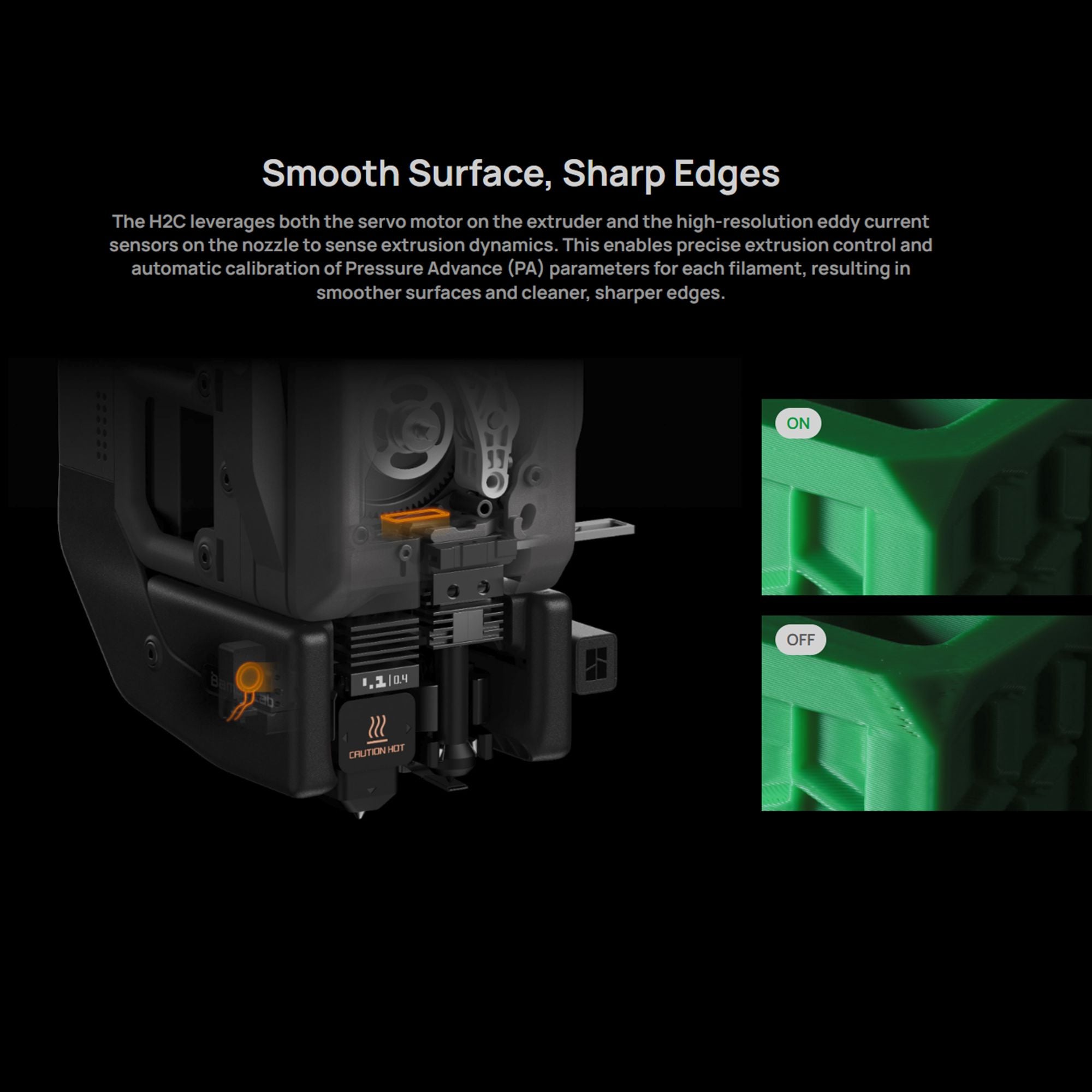The H2C leverages both the servo motor on the extruder and the high-resolution eddy current sensors on the nozzle to sense extrusion dynamics. This enables precise extrusion control and automatic calibration of Pressure Advance (PA) parameters for each filament, resulting in smoother surfaces and cleaner, sharper edges.