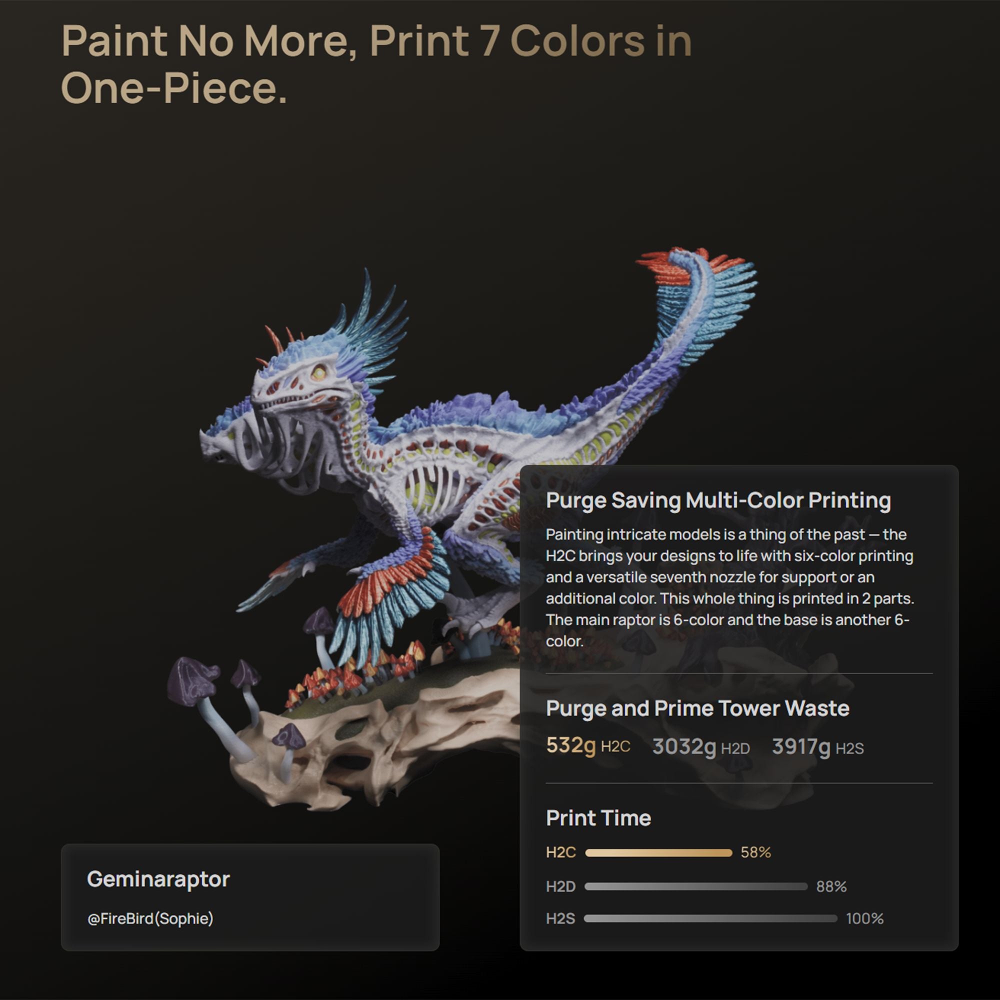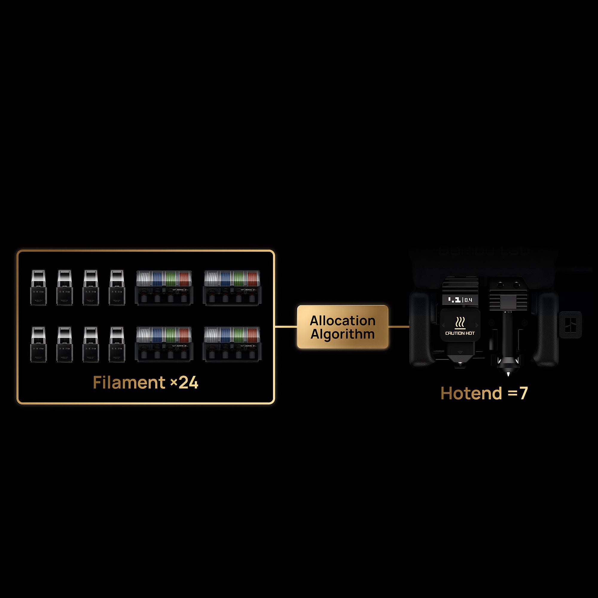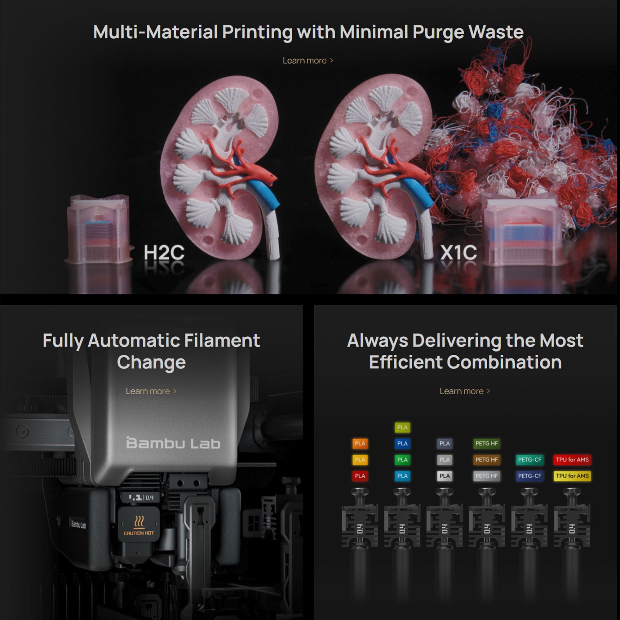 Unlike traditional tool changer printers that limit color count by the number of toolheads, the H2C supports up to 24 materials in a single print through parallel-connected AMS units. Its intelligent algorithm optimizes filament-to-hotend allocation to minimize purge waste while delivering outstanding multi-color and multi-material results.