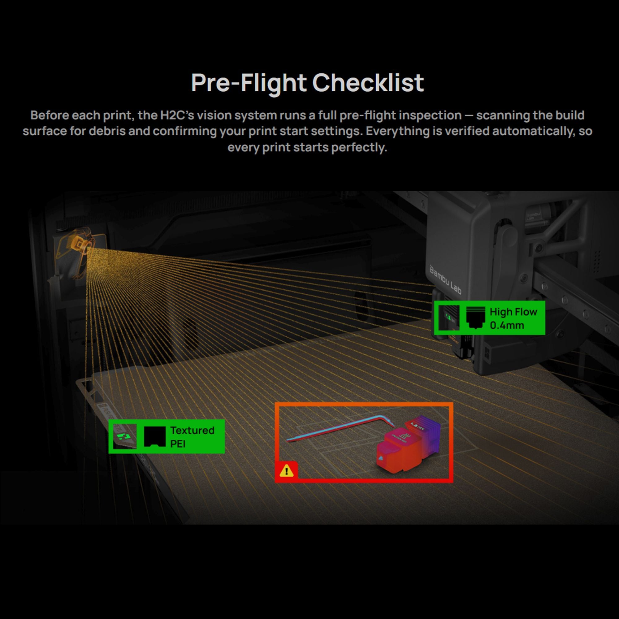 Before each print, the H2C's vision system runs a full pre-flight inspection — scanning the build surface for debris and confirming your print start settings. Everything is verified automatically, so every print starts perfectly.