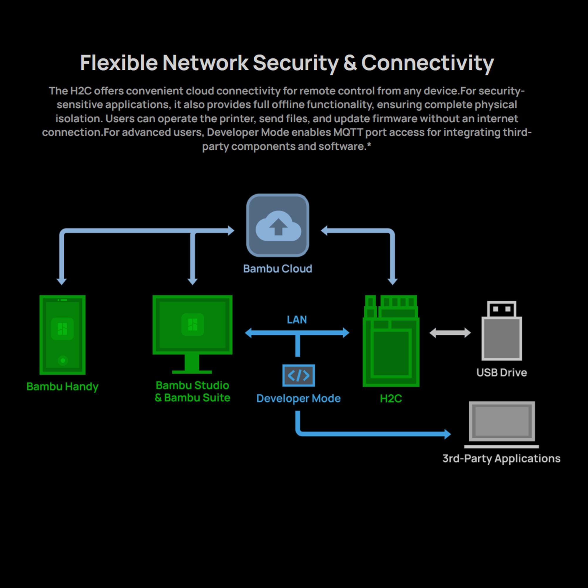 The H2C offers convenient cloud connectivity for remote control from any device. For security-sensitive applications, it also provides full offline functionality, ensuring