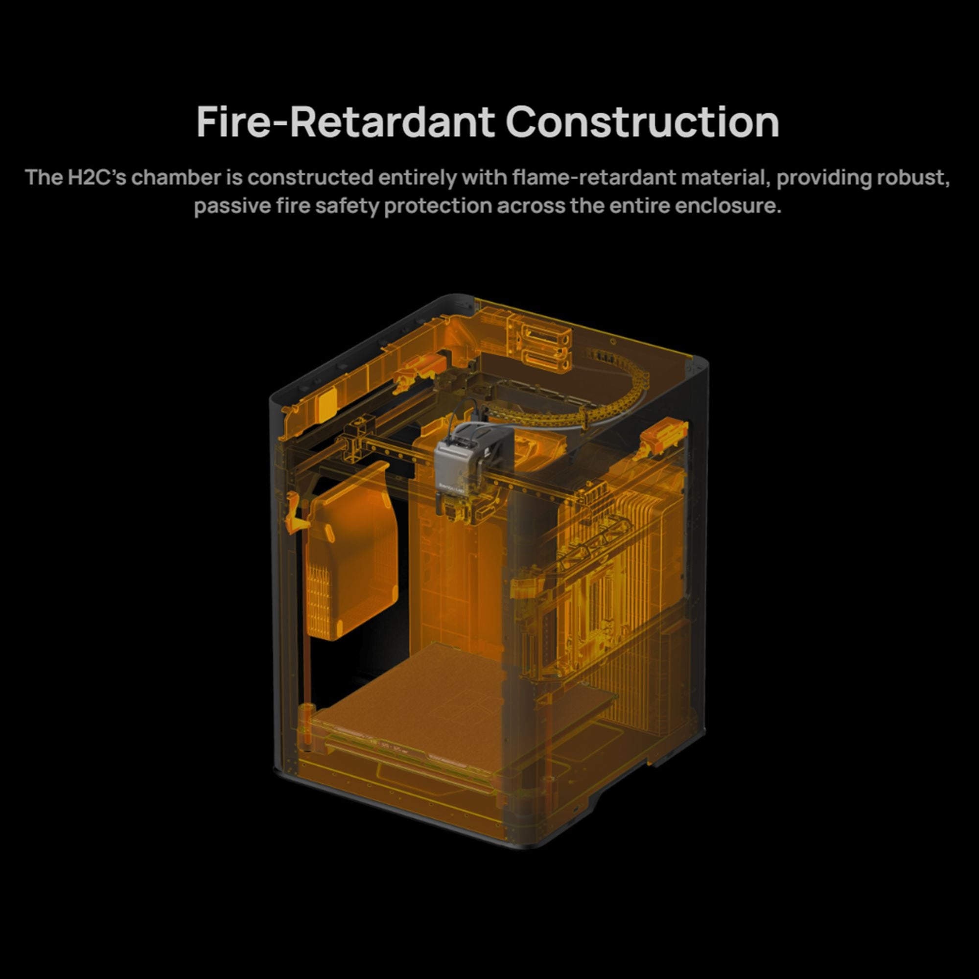 The H2C's chamber is constructed entirely with flame-retardant material, providing robust, passive fire safety protection across the entire enclosure.