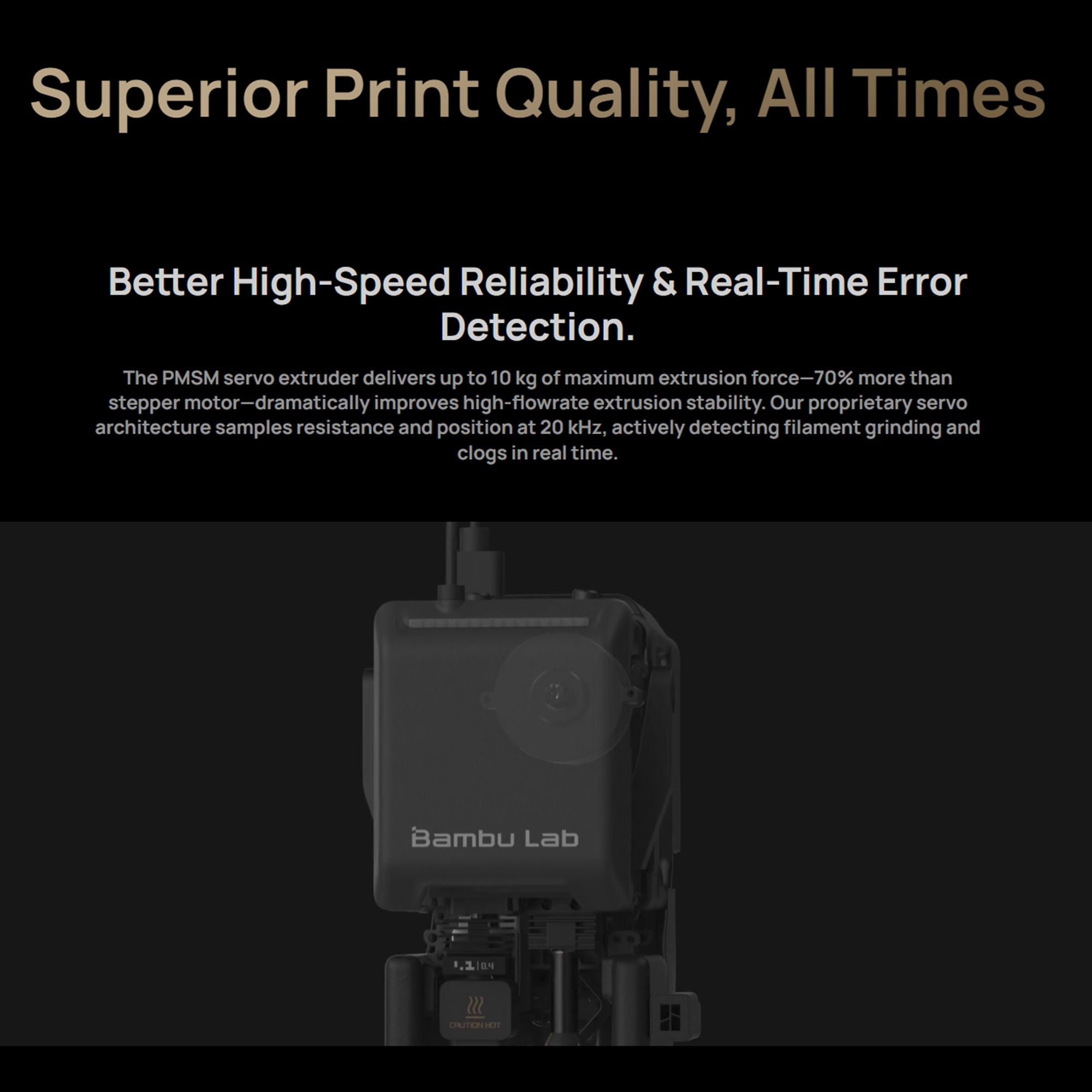 The PMSM servo extruder delivers up to 10 kg of maximum extrusion force dramatically improves high-flowrate extrusion stability. Our proprietary servo architecture samples resistance and position at 20 kHz, actively detecting filament grinding and clogs in real time.