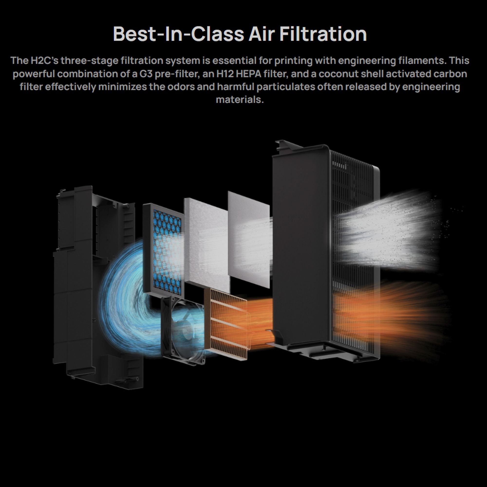 The H2C's three-stage filtration system is essential for printing with engineering filaments. This powerful combination of a G3 pre-filter, an H12 HEPA filter, and a coconut shell activated carbon filter effectively minimizes the odors and harmful particulates often released by engineering materials.