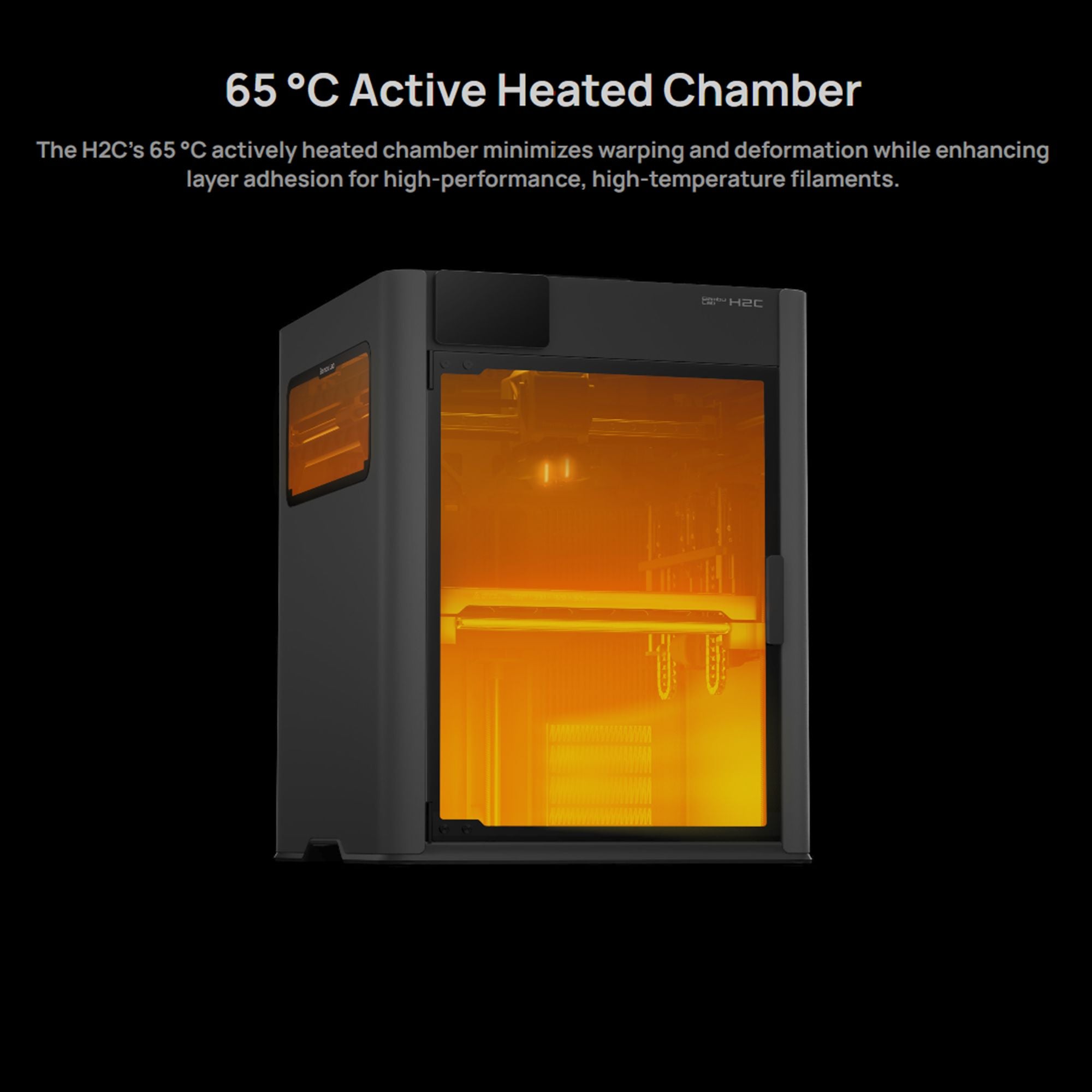 The H2C's 65 °C actively heated chamber minimizes warping and deformation while enhancing layer adhesion for high-performance, high-temperature filaments.