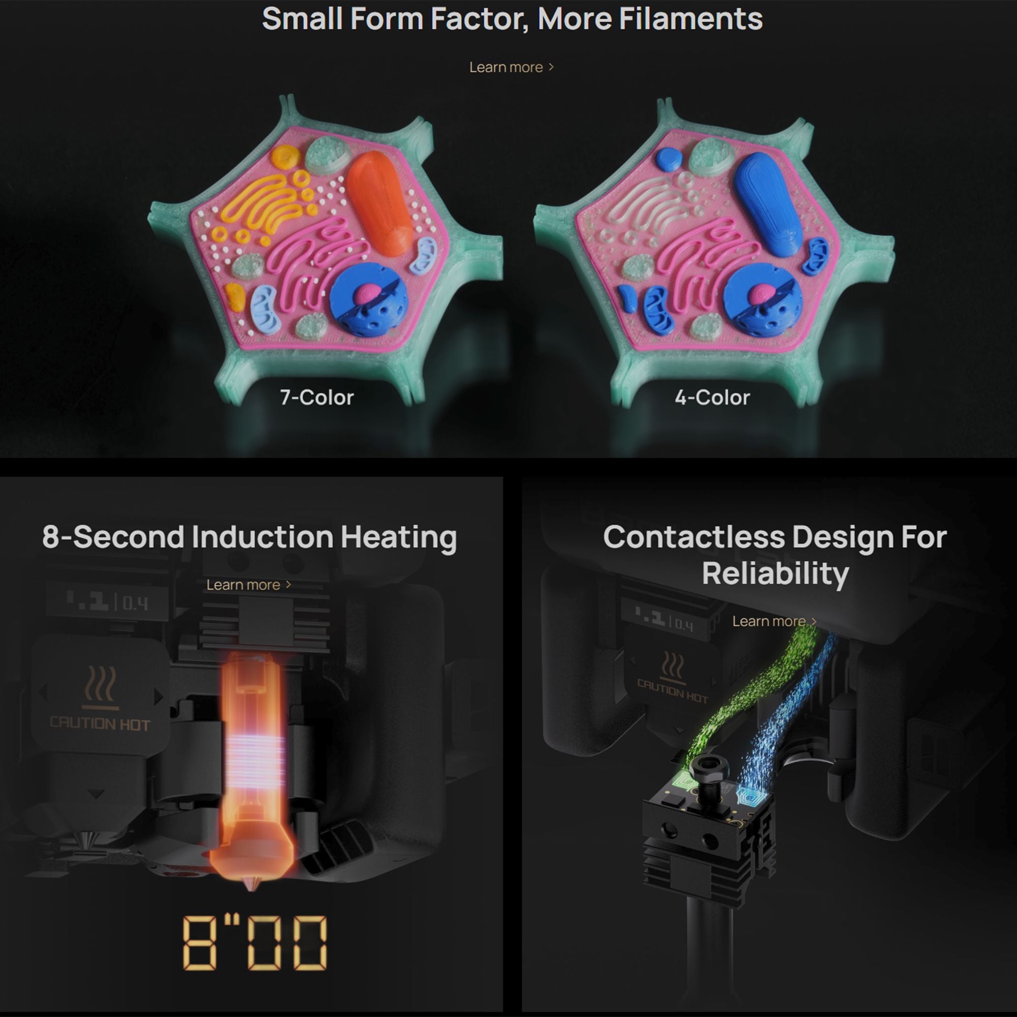 Our high standards for reliability led us to move away from contact-based metal pins, which are prone to oxidation and unstable connections. We developed a contactless solution that ensures a stable, high-frequency connection — the foundation for precise temperature control and intelligent hotend sync.