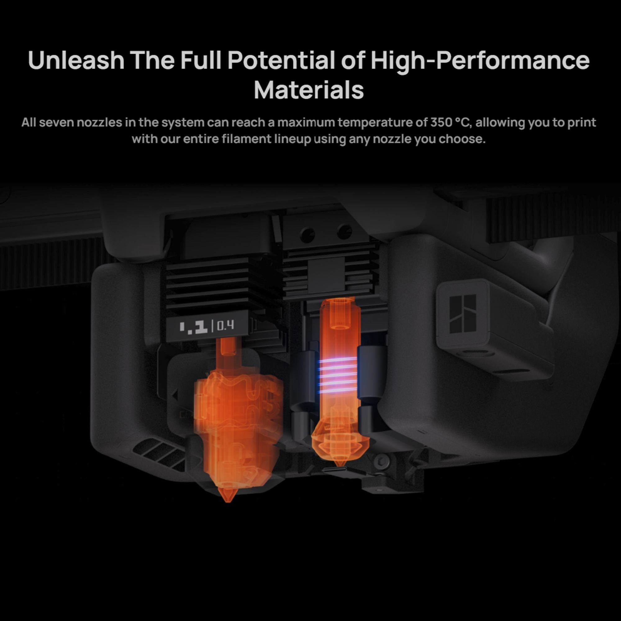 All seven nozzles in the system can reach a maximum temperature of 350 °C, allowing you to print with our entire filament lineup using any nozzle you choose.