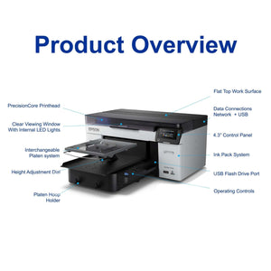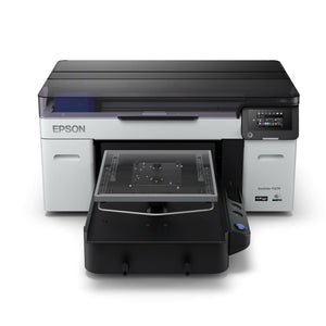 Open new doors for your printing business with the versatile SureColor F2270 - #SCF2270SE. Purpose-built for both direct-to-garment (DTG) and DTFilm printing, this hybrid printer combines outstanding image quality, easy operation and great value. With DTFilm printing capability, go beyond traditional garment printing and transfer to a wider variety of materials, including uniquely shaped items. Featuring a PrecisionCore MicroTFP printhead and next-generation UltraChrome DG2 Ink, the F2270 delivers vibrant colors and incredible detail with up to 20% faster speeds than the Epson F2100. What’s more, the printer’s cartridge-free bulk ink pack system helps reduce ink replacement frequency. Featuring automatic garment thickness adjustment, robust Epson Garment Creator 2 software, easy user maintenance features to help reduce downtime, and an intuitive design with a large 4.3" touchscreen interface and quick-load platen, the innovative F2270 brings you a new level of productivity and efficiency to meet customer demand head-on. We offer financing options on all Epson F2100 Bundles.