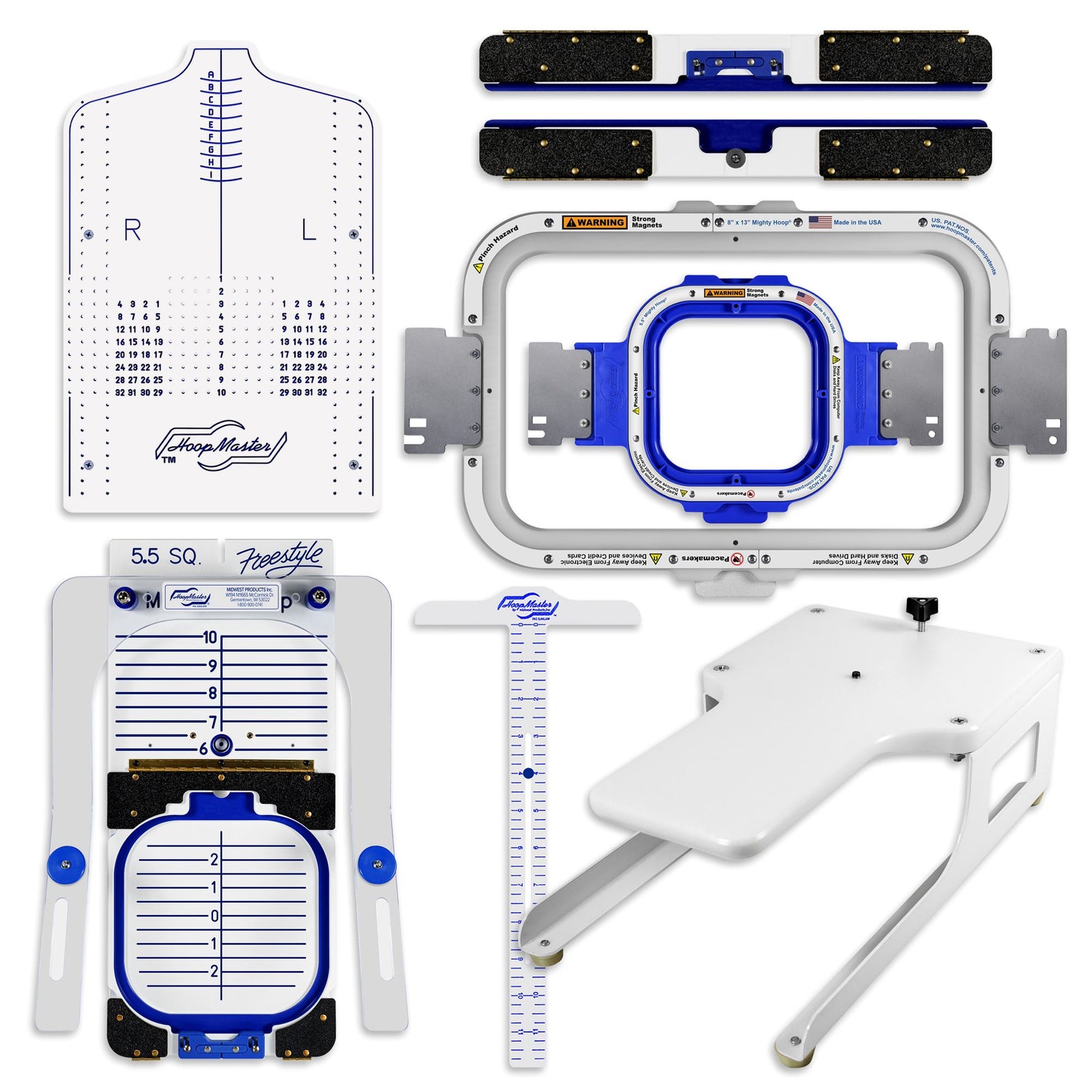 This HoopMaster System kit contains everything you need for the 5.5″ & 8" x 13" Mighty Hoops for BAi Embroidery Machines. The HoopMaster system helps align and apply the Mighty Hoops to garments. The HoopMaster is not required to use the Mighty Hoops, but it will make the hooping process quick, easy, accurate and consistent. This is the most common kit sold to new customers.