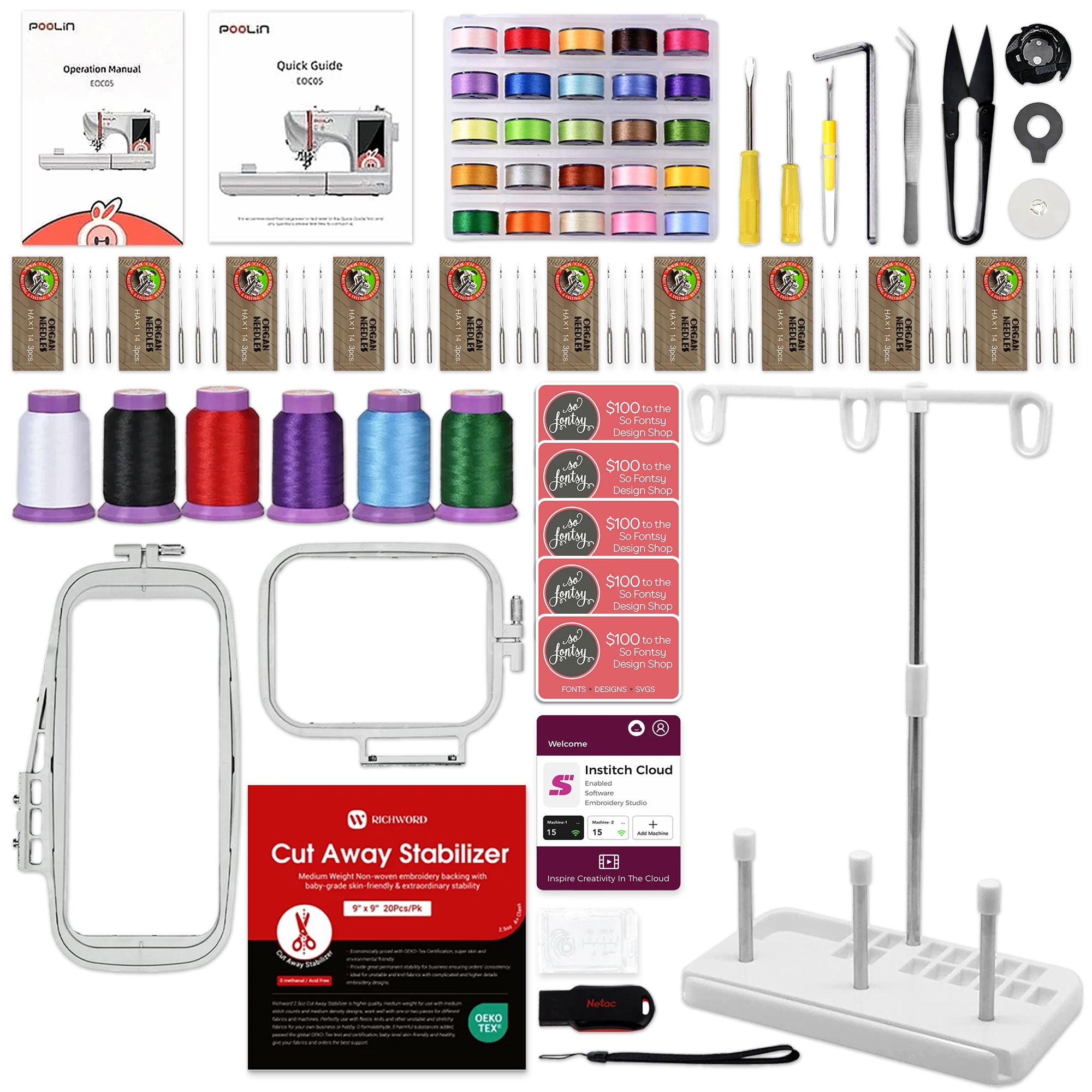 POOLIN EOC05 home Automatic Embroidery Machine. Great for Beginners and users who do not require a large embroidery area. The EOC05 includes a 7'' Large LCD Touchscreen, 96 Built-in Designs, and 4" x 9.2" Large Embroidery Area, Wifi Enabled.