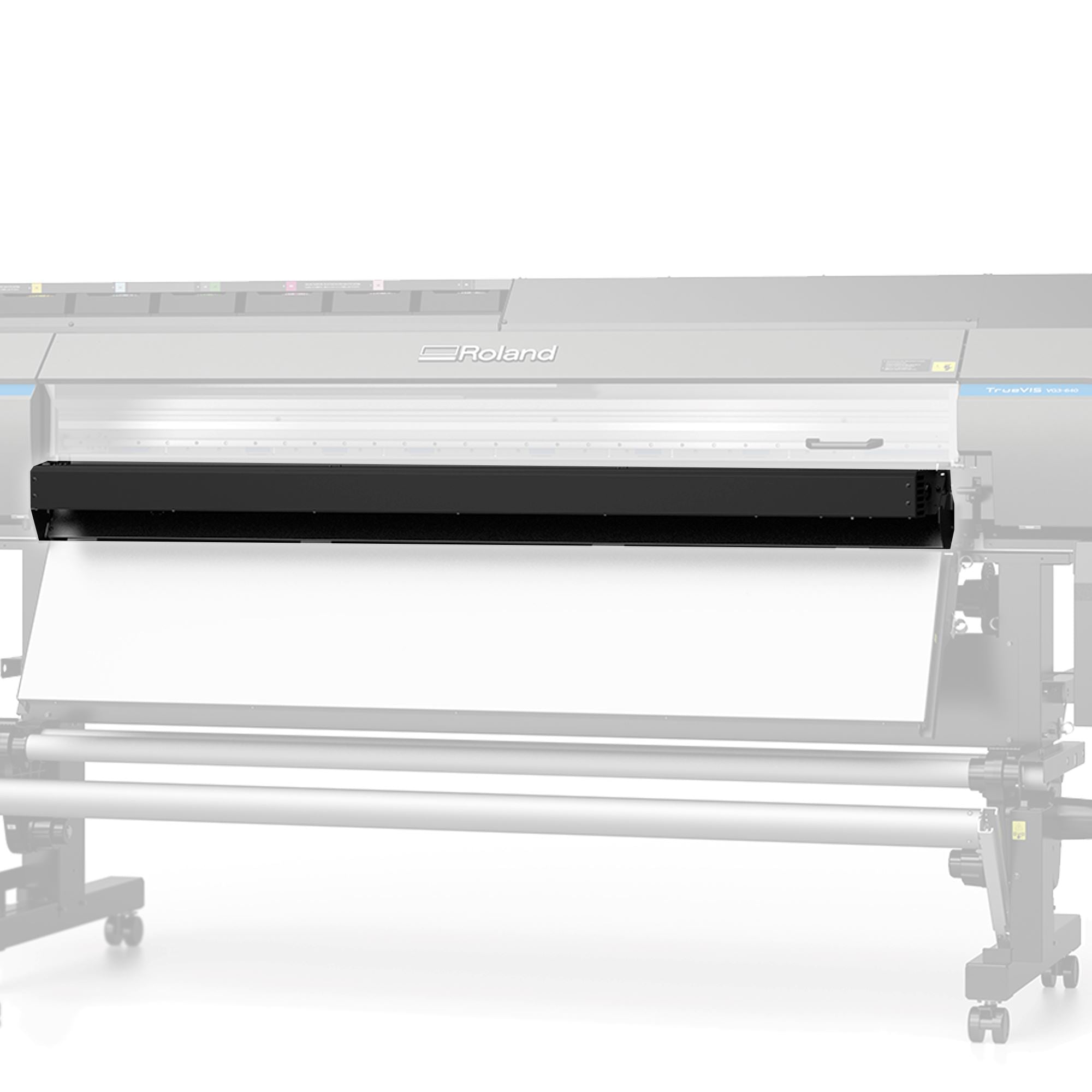 The optional ventilation / drying system improves dry times for roll-to-roll applications at higher speeds or for applications that require heavier loads of white ink. This is an auxiliary drying unit that combines a drying-heater unit and a blower-fan unit. It uses the drying heater unit to dry the ink by warming the media after printing. It also uses the blower-fan unit to dry the ink by blowing air against the surface of the media.