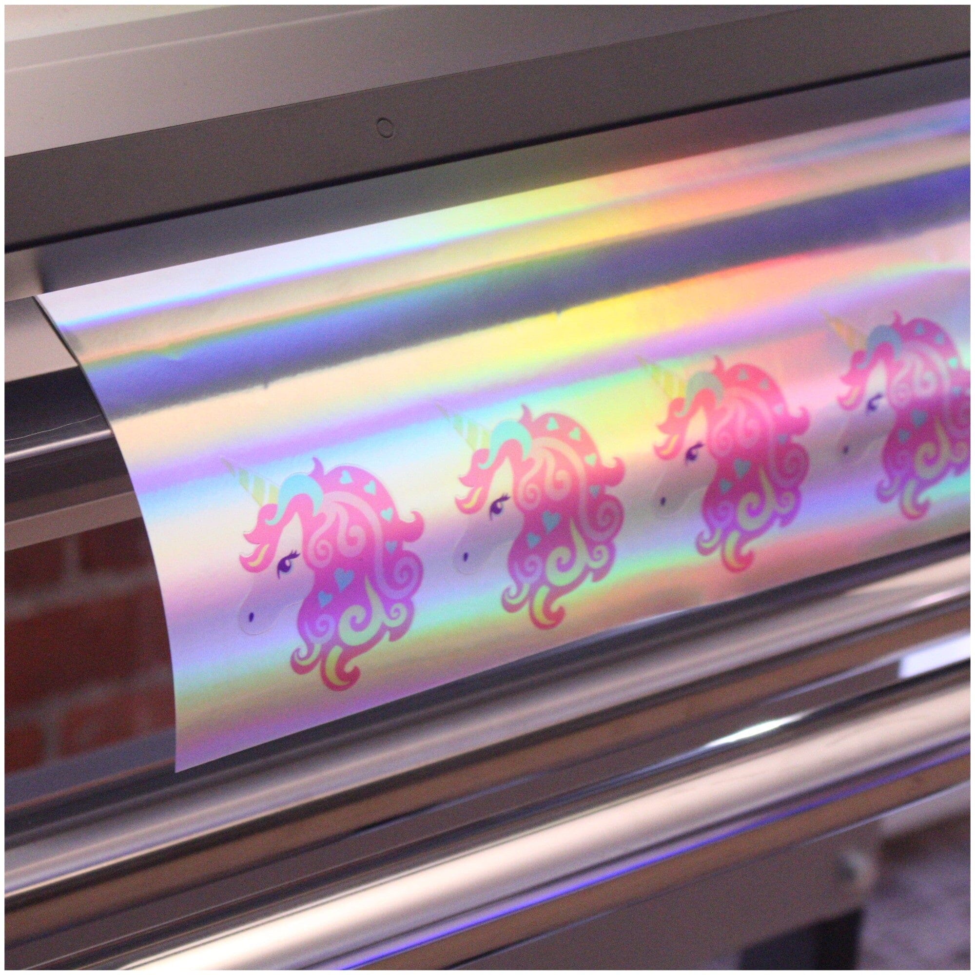 Our Holographic Prismatic Film with Adhesive (ESM-HOLO) is a 6 mil holographic prismatic printable film that has a general-purpose adhesive. It is an excellent choice for eye-catching, attention-grabbing graphics. This is good for indoor and outdoor applications. For added durability that won't affect the holographic effect, use this in conjunction with our GuardLam gloss overlaminate film. *NOTE: Due to the embossing process, there will be lines (shim marks) on the media every 12" across the width of the roll which is hidden once printed on.