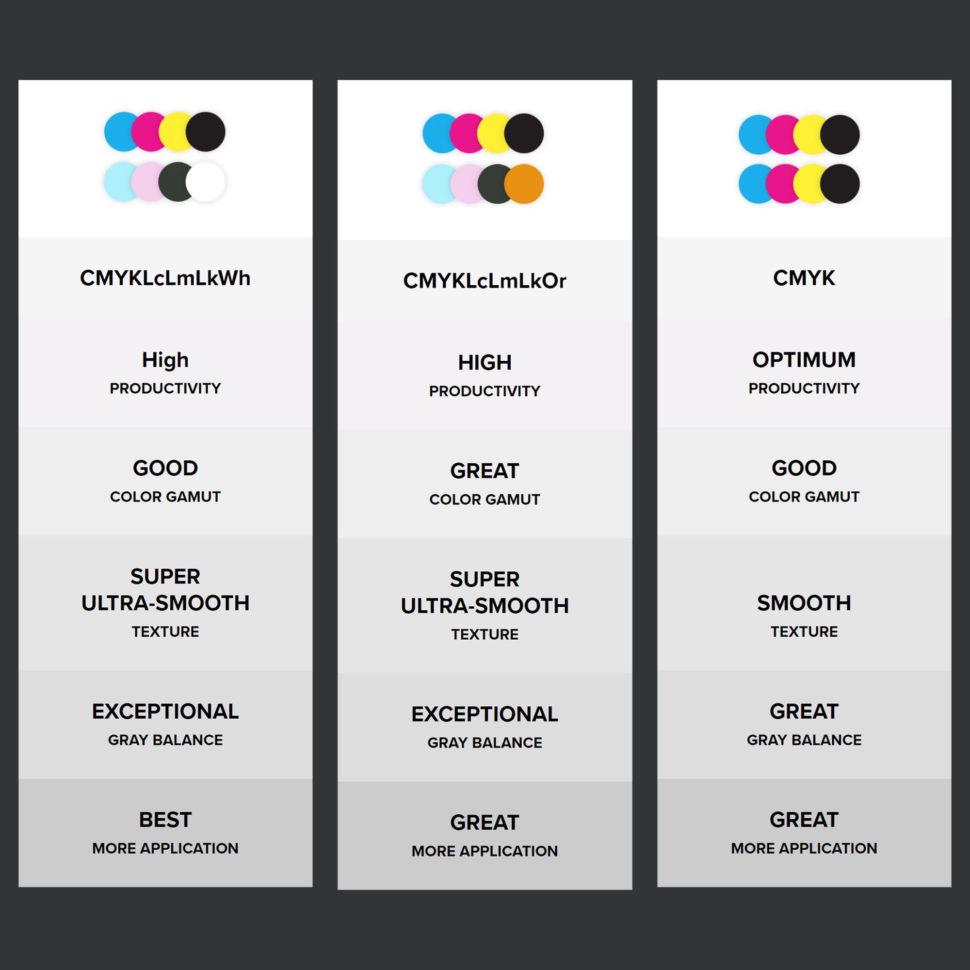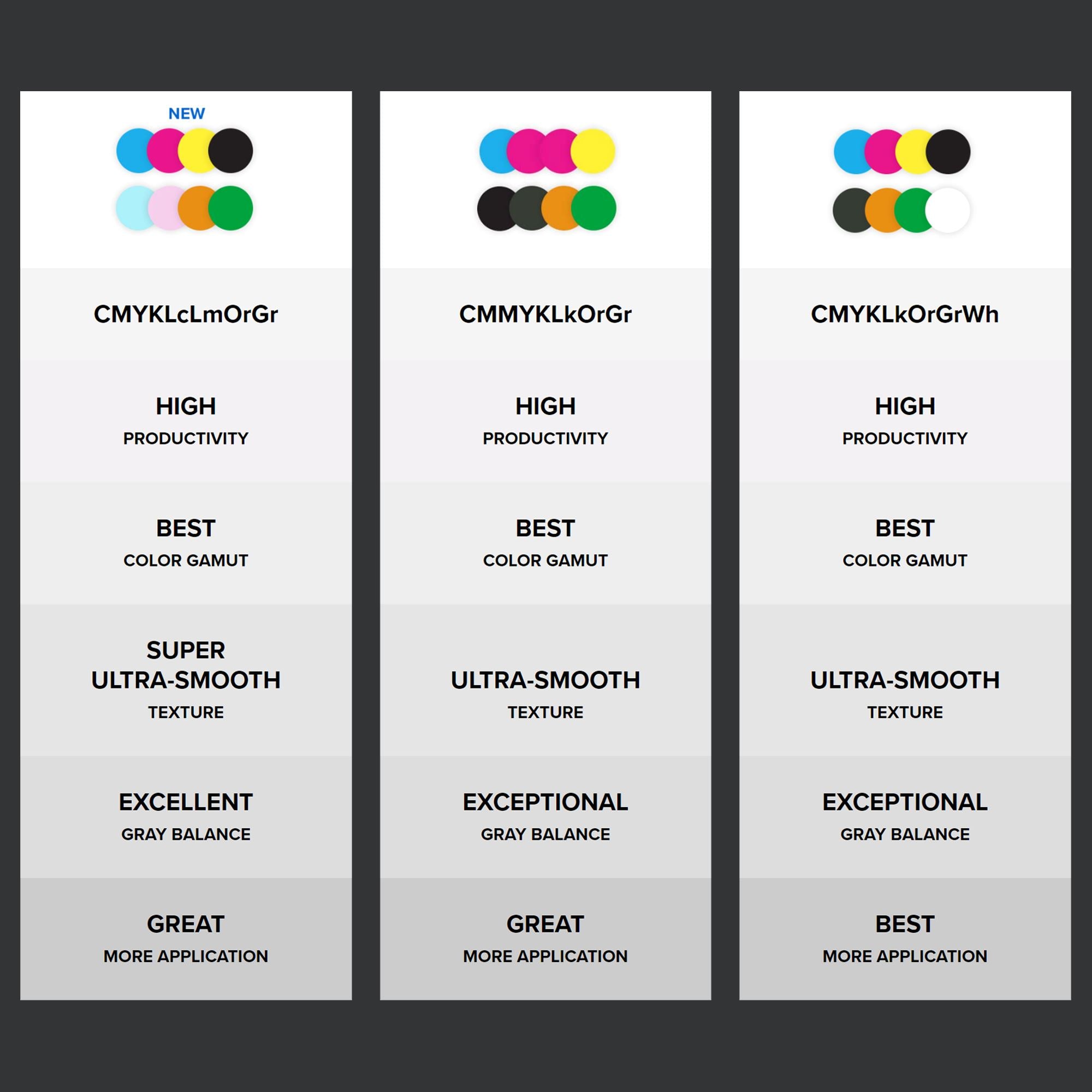With Orange, Green, Light Black, and other inks available in new configurations, you can consistently hit very specific Pantone shades and company brand colors as well as outputting graphics with smooth gradients and skin tones. Not only do new ink configurations offer our widest color gamut yet, but they also provide more choice in your color output with options that include quick color output and a series of options with high intensity color, intensely smooth color, and other complex color choices.