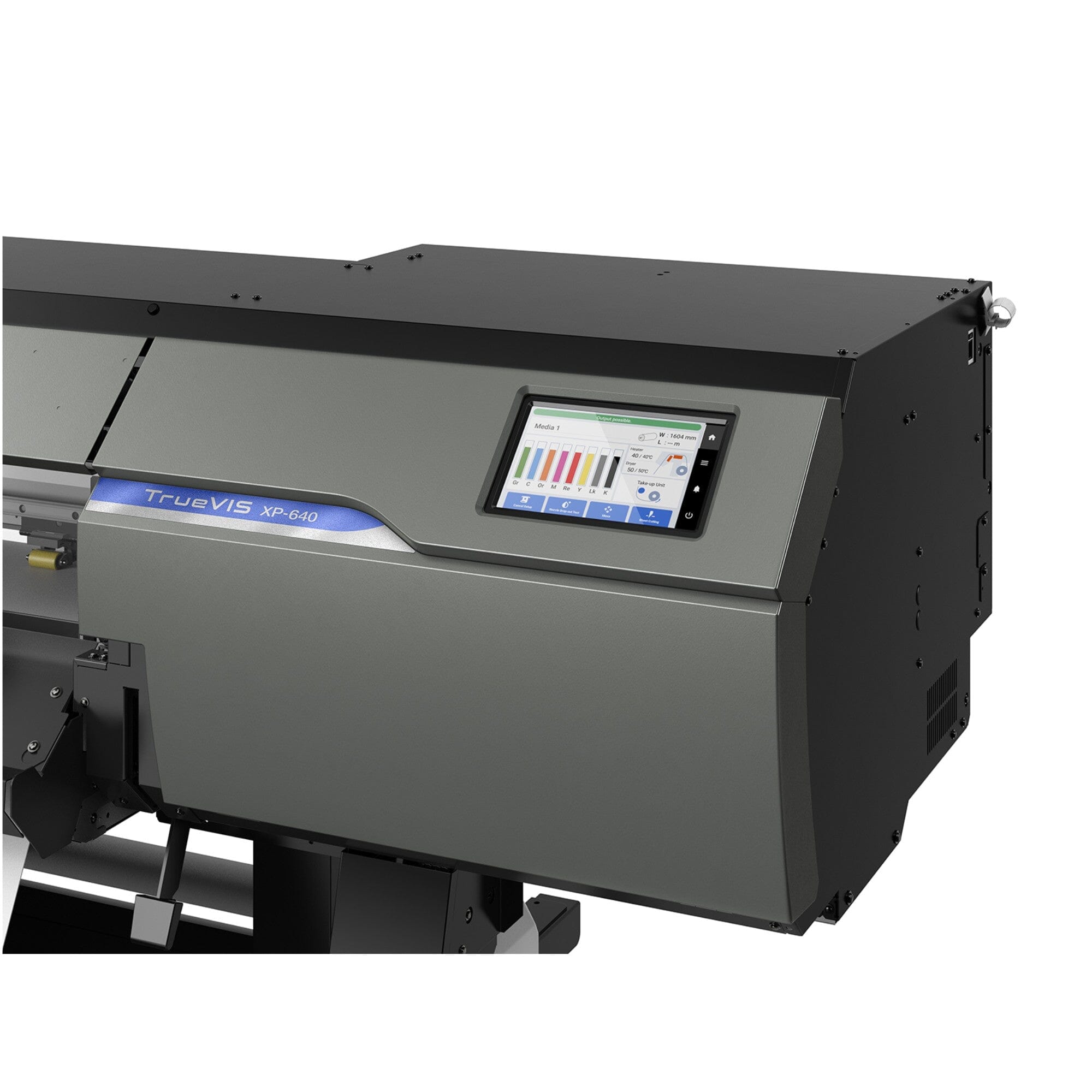 Available in 8-color (CMYKLkOrGrRe) and dual CMYK configurations, the TrueVIS XP-640 offers the ultimate blend of image quality and productivity, allowing you to print higher-quality output faster than ever before. In billboard mode, the 8-color configuration allows for an extremely wide color gamut, while the 4-color setup produces vivid prints at a rapid 819 sqft/h.