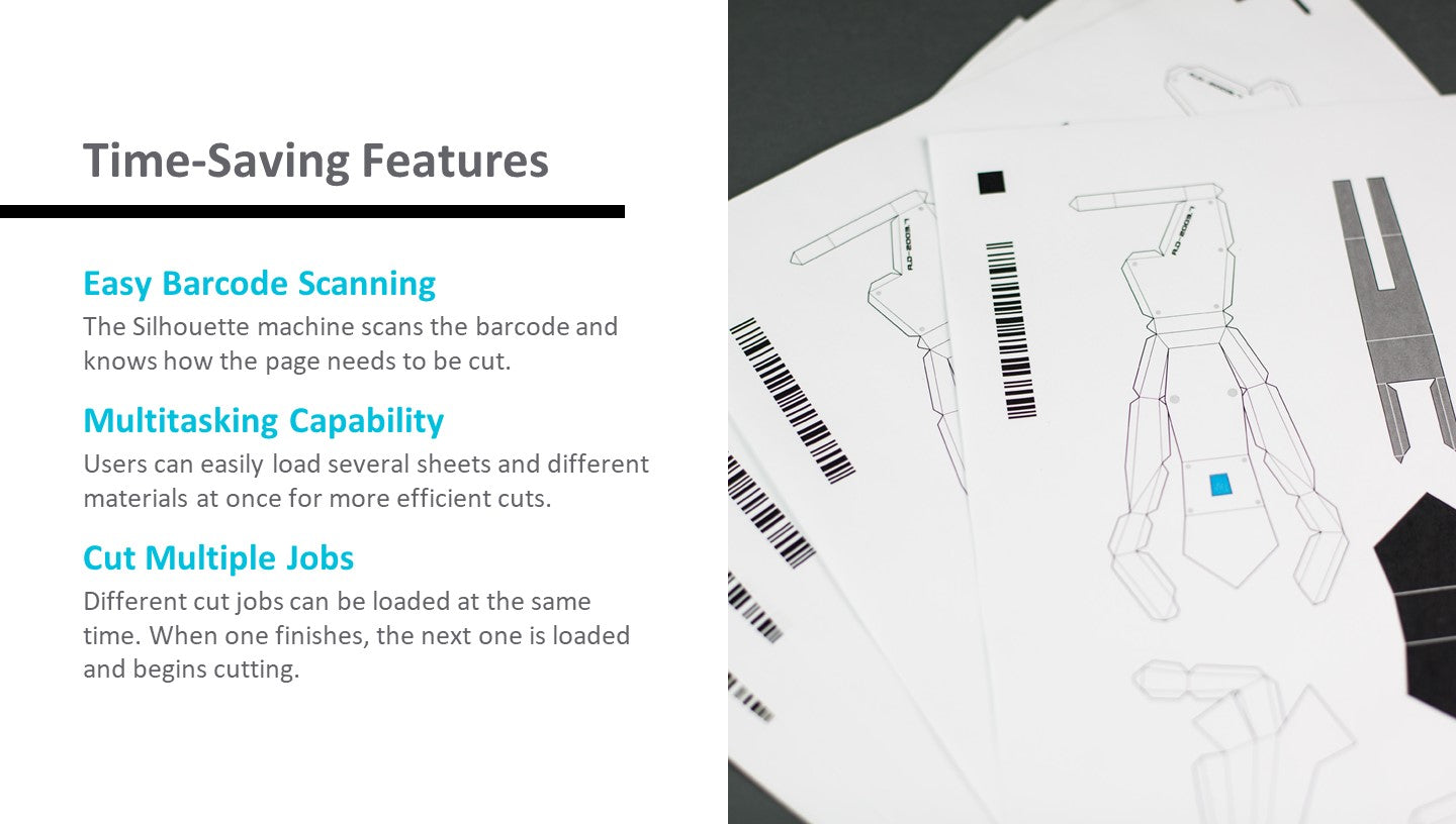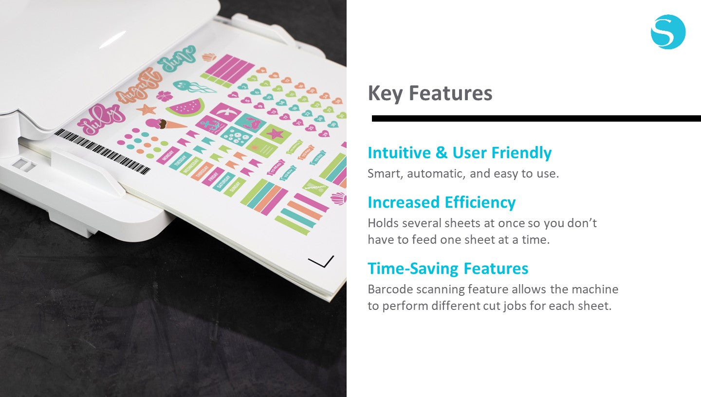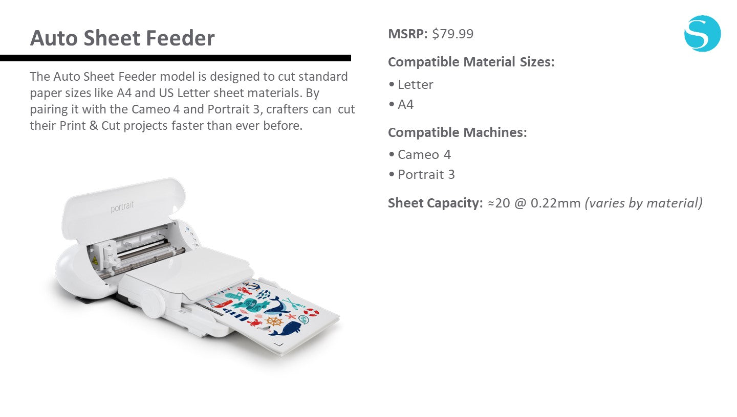 The Auto Sheet Feeder simplifies the bulk cutting process by automatically loading sheet materials into your Silhouette cutting machine. Place up to 20 sheets of material into the top tray and set the number of copies to be cut in Silhouette Studio®. Then, the Auto Sheet Feeder loads each sheet into the cutting machine and ejects it below the loading tray or behind the cutting machine for a seamless, matless cut job. Cut the same design multiple times, or send different cut jobs at the same time using barcodes. The Auto Sheet Feeder is compatible with the Silhouette Portrait 3 and Cameo 4.