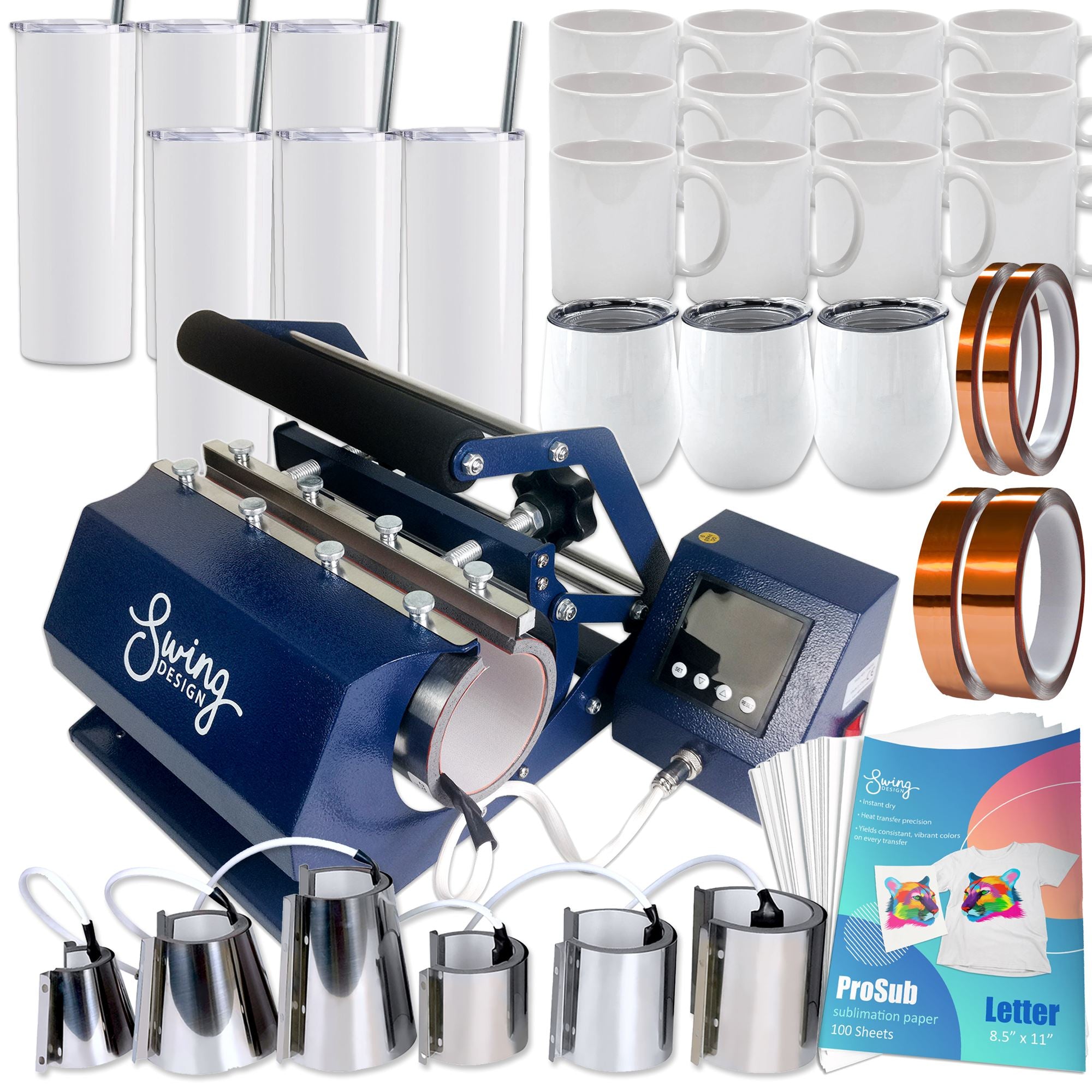 Swing Design's Digital 7-in-1 ProSub Tumbler Heat Press is a rugged press designed to give you a professional image transfer onto sublimation tumblers, mugs, cups, and water bottles.  With the 7 attachments, the heat press can accommodate various diameters and shaped cups & mugs including all the most popular sublimation styles.  The full wrap heating pads with enlarged high-grade heating elements and advanced adjustable pressure ensure a beautiful and vibrant transfer.  Transfer onto tumblers, mugs, water bottles, shot glasses, beer glasses, latte cups, and more.  Great for both sublimation transfers and heat transfer vinyl.