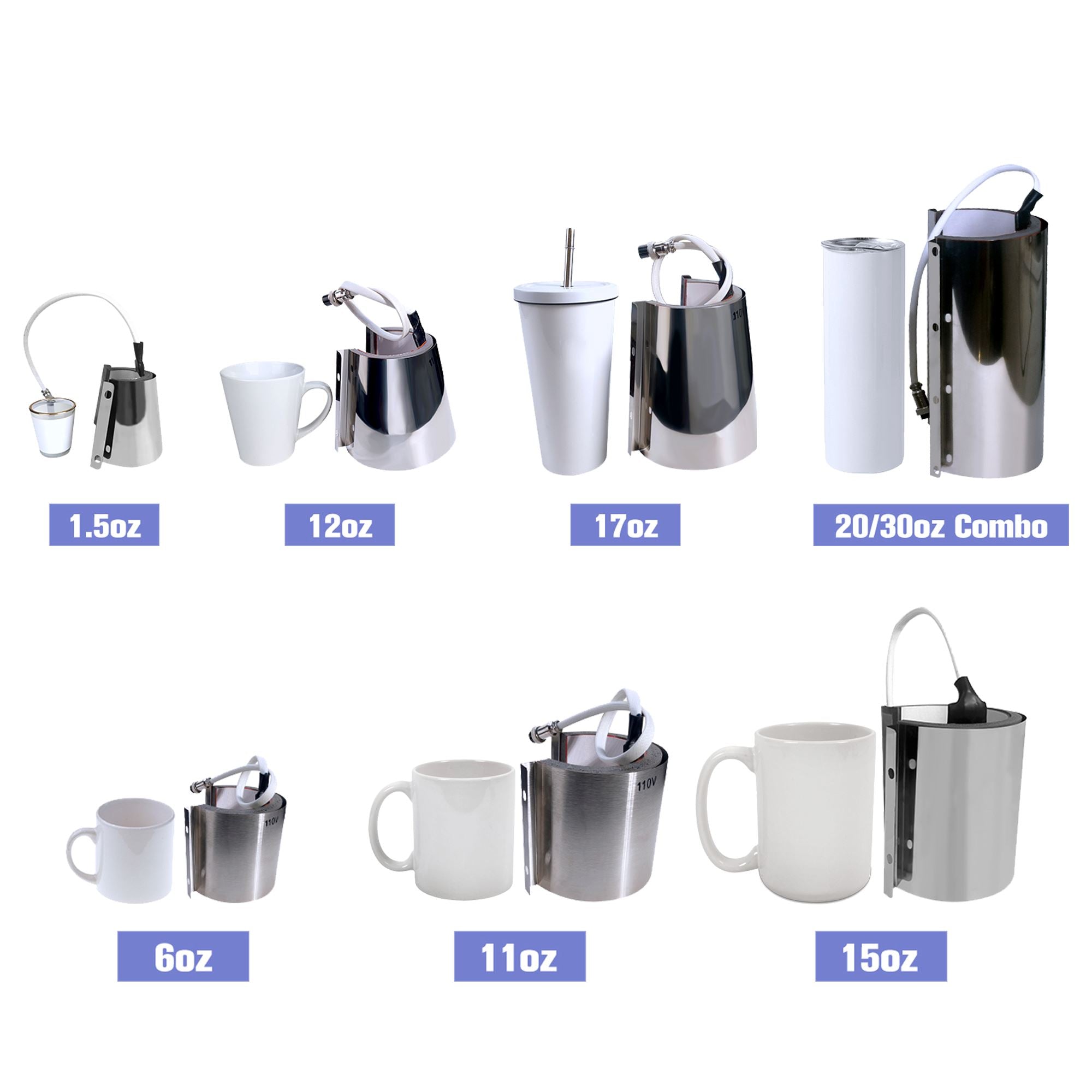 Swing Design's Digital 20oz & 30oz ProSub Tumbler Heat Press is a rugged press designed to give you a professional image transfer onto sublimation tumblers, mugs, cups, and water bottles.  With up to 7 optional attachments the heat press can accommodate various diameters and shaped cups & mugs including all the most popular sublimation styles.  The full wrap heating pads with enlarged high-grade heating elements and advanced adjustable pressure ensure a beautiful and vibrant transfer.  Transfer onto tumblers, mugs, water bottles, shot glasses, beer glasses, latte cups, and more.  Great for both sublimation transfers and heat transfer vinyl.