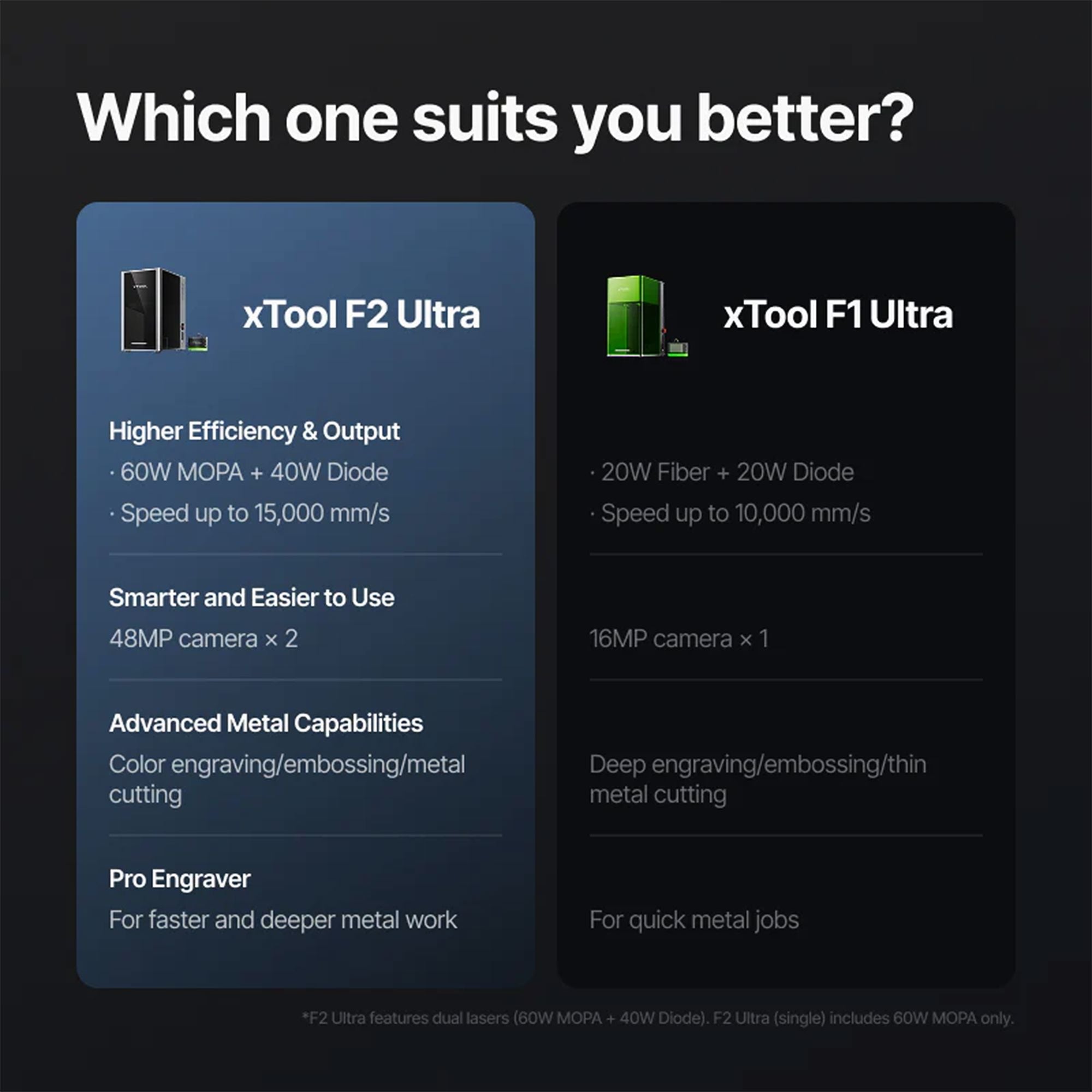 The xTool F2 Ultra is available in two configurations to cater to different needs and budgets. Below, we compare the Dual Laser (60W MOPA + 40W Diode) and Single Laser (60W MOPA) options to help you choose the best fit for your projects.