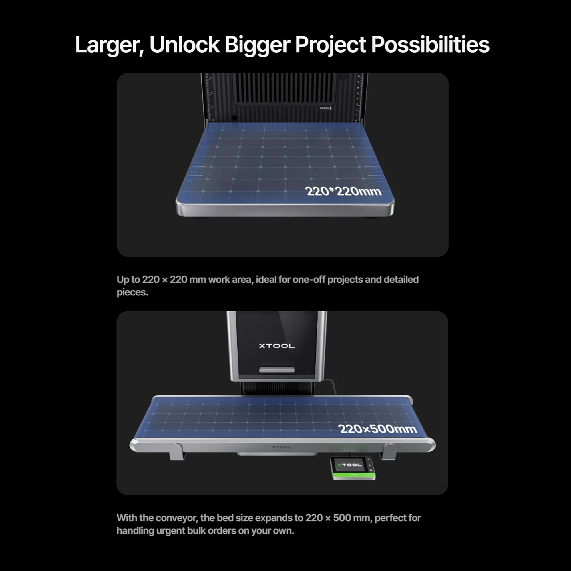Large Working Area: The 220mm x 220mm work bed supports detailed projects, expandable to 220mm x 550mm with the optional conveyor for bulk engraving tasks.