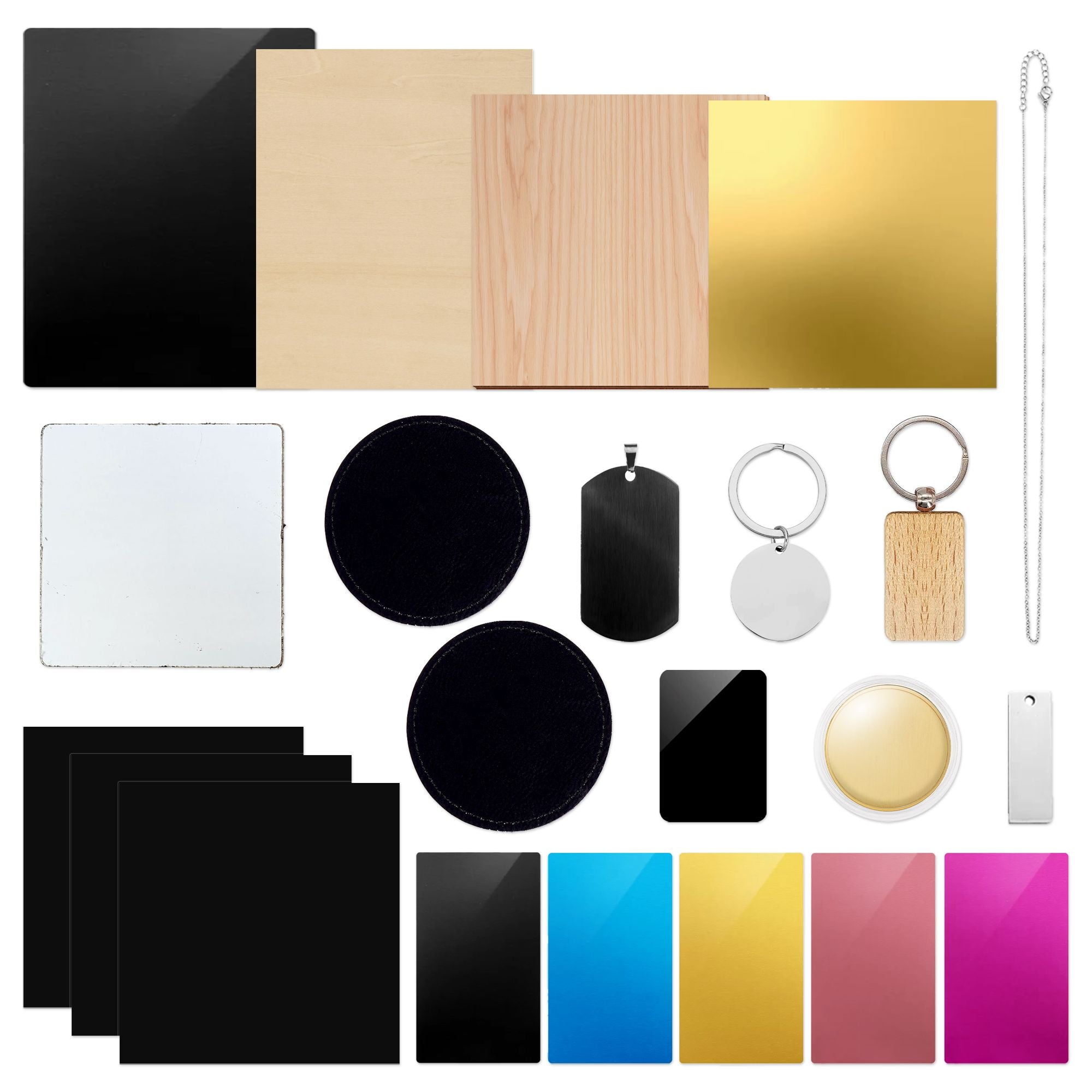 Metals (stainless steel, aluminum, brass, etc.) + Non-metals (wood, acrylic, leather, paper, etc.) |