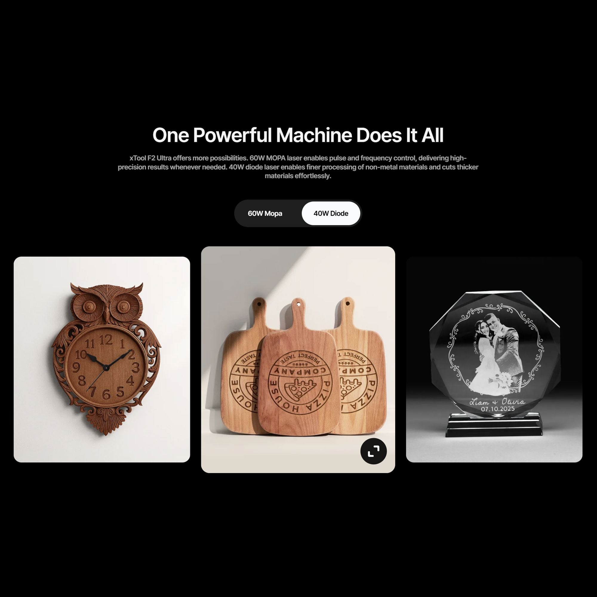 The dual-laser F2 Ultra is the ultimate all-in-one solution for makers who work with a wide range of materials. The 60W MOPA laser delivers vibrant color marking and deep engraving on metals, while the 40W diode laser excels at cutting and engraving non-metals like wood, acrylic, and leather. This option is perfect for businesses offering diverse products, such as personalized gifts, retail displays, or custom packaging. With the ability to cut 23mm wood and engrave intricate designs on transparent acrylic, this model unlocks endless creative possibilities.