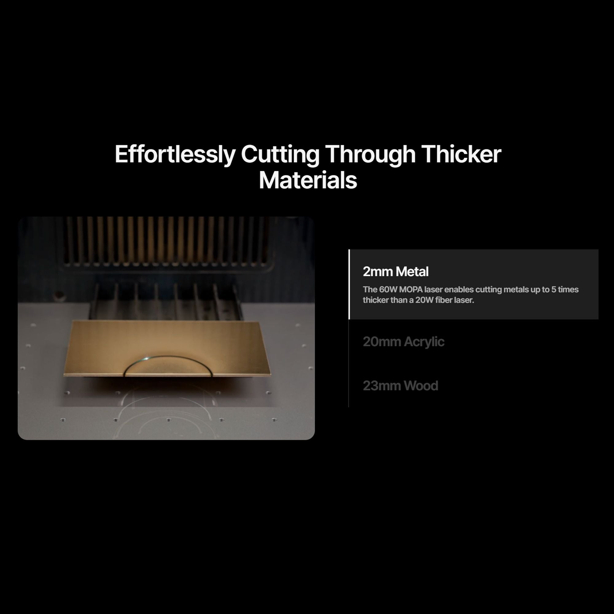 Dual Laser Powerhouse: The 60W MOPA fiber laser excels at deep engraving, full-color marking, and embossing on metals like stainless steel, aluminum, brass, silver, titanium, and more. The 40W diode laser effortlessly handles non-metals, cutting up to 23mm thick wood and engraving materials like leather, acrylic, paper, and bamboo with precision.